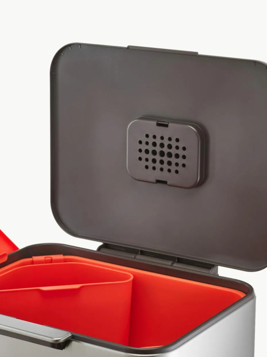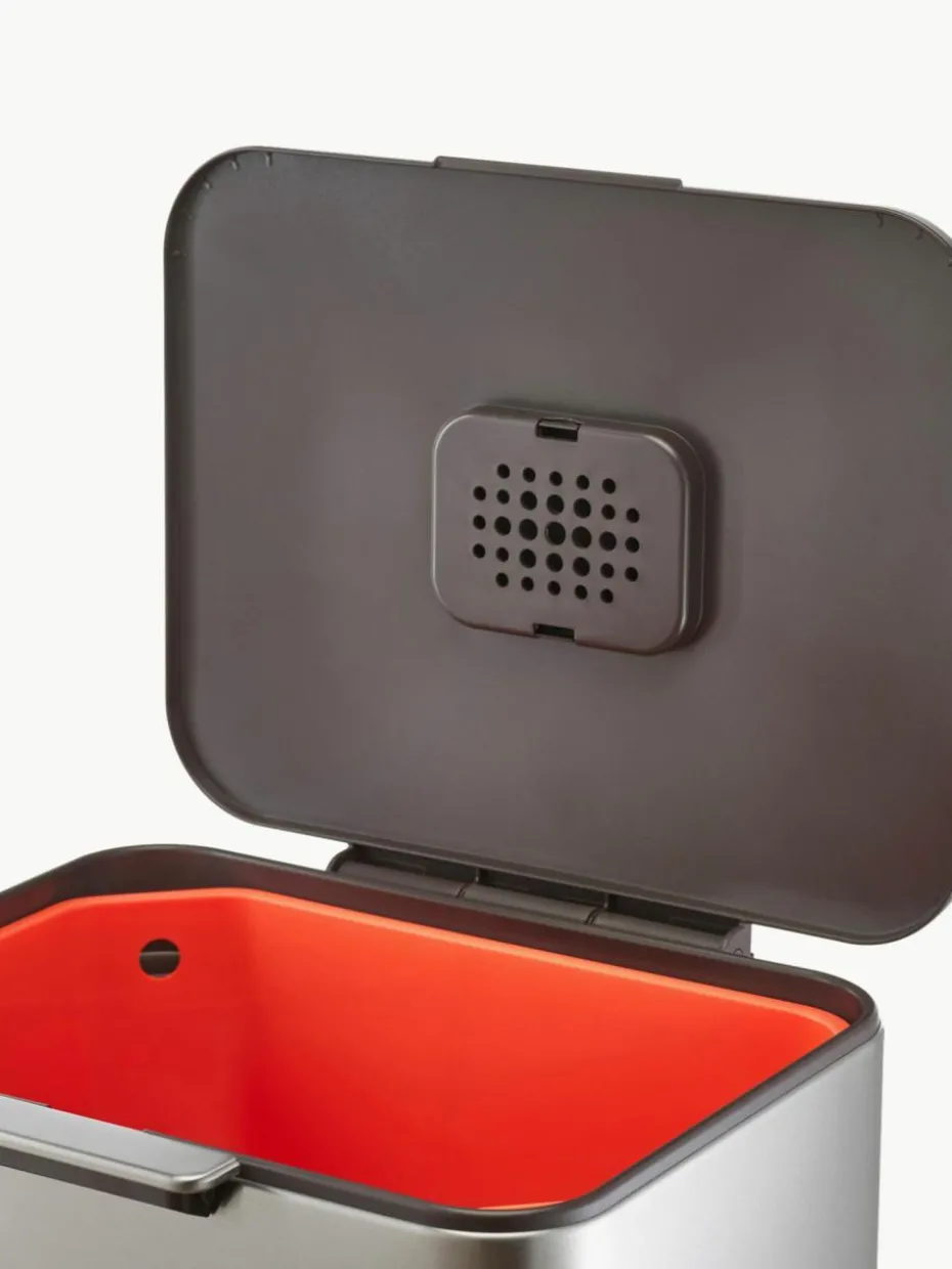 Der Abfalleimer verfügt über ein Mülltrennsystem mit Soft-Closing Funktion. Dank der Stay-Open-Funktion kann der Abfallbehälter leicht gereinigt werden. Zudem schützt die spezielle Beschichtung vor Fingerabdrücken. Der integrierte Aktivkohlefilter im Deckel reduziert unangenehme Gerüche.