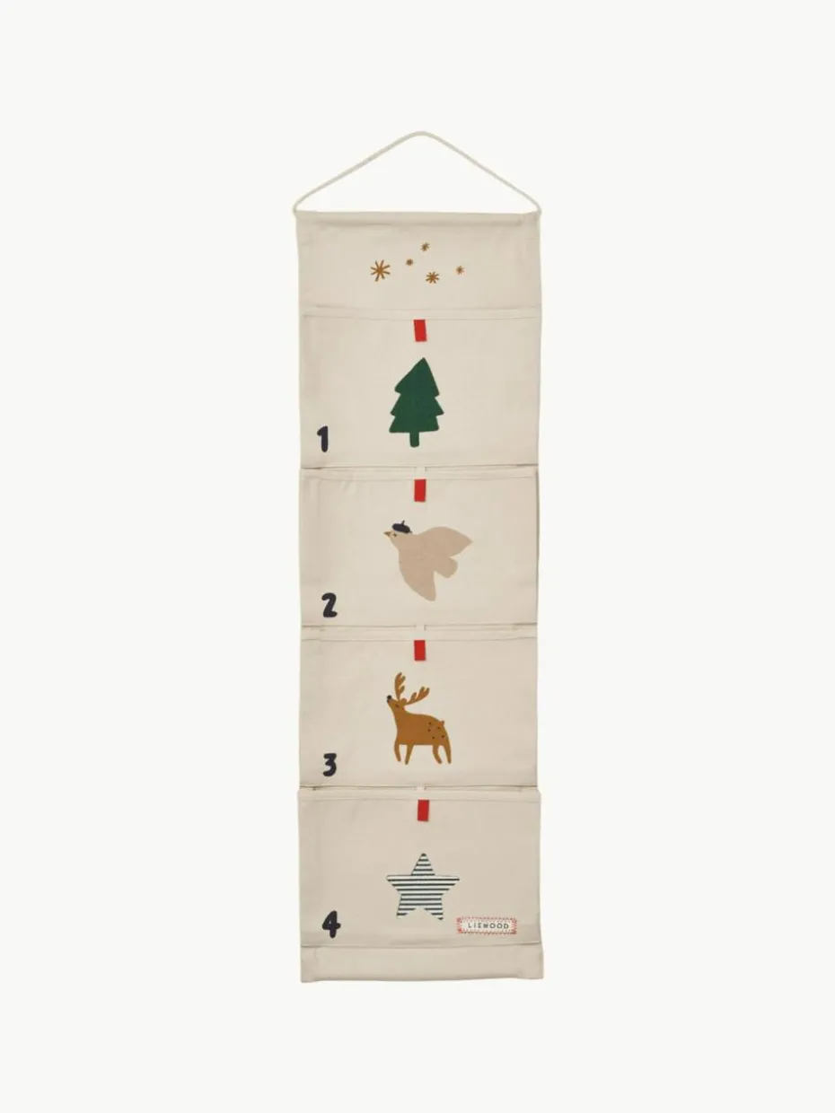 Der Adventskalender ist eine zeitlose Dekoration, die Jahr für Jahr die Vorfreude auf das Fest steigert. Mit vier Taschen, die mit aufgedruckten Weihnachtselementen verziert sind, ist er perfekt für kleine Geschenke. Zusätzlich sind Schlaufen für größere Überraschungen vorgesehen. Hänge ihn an die Wand oder die Tür.