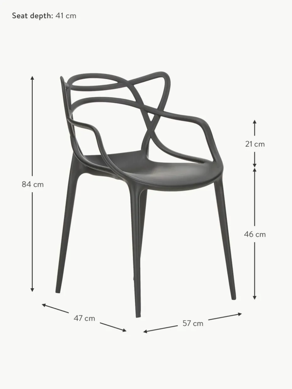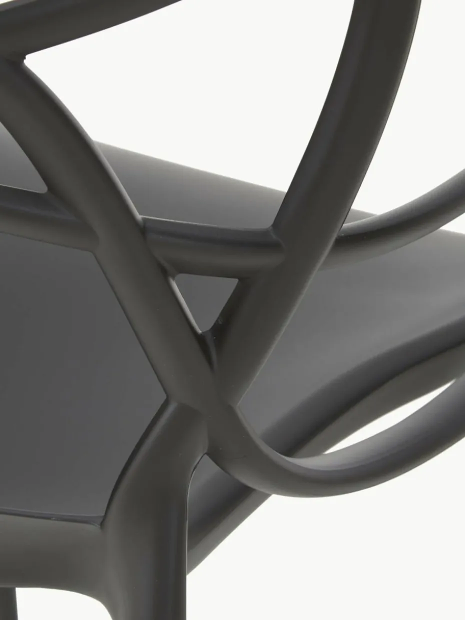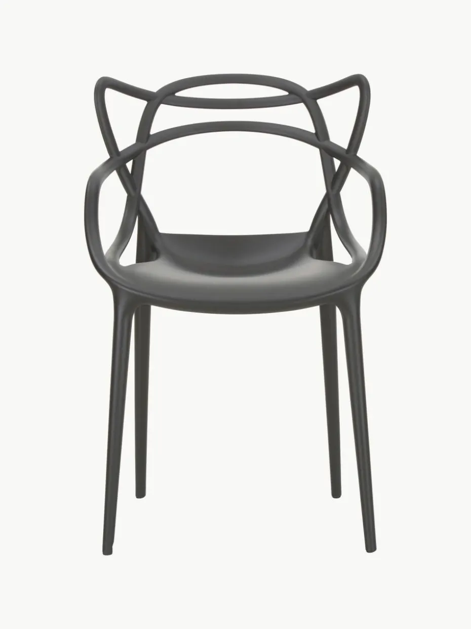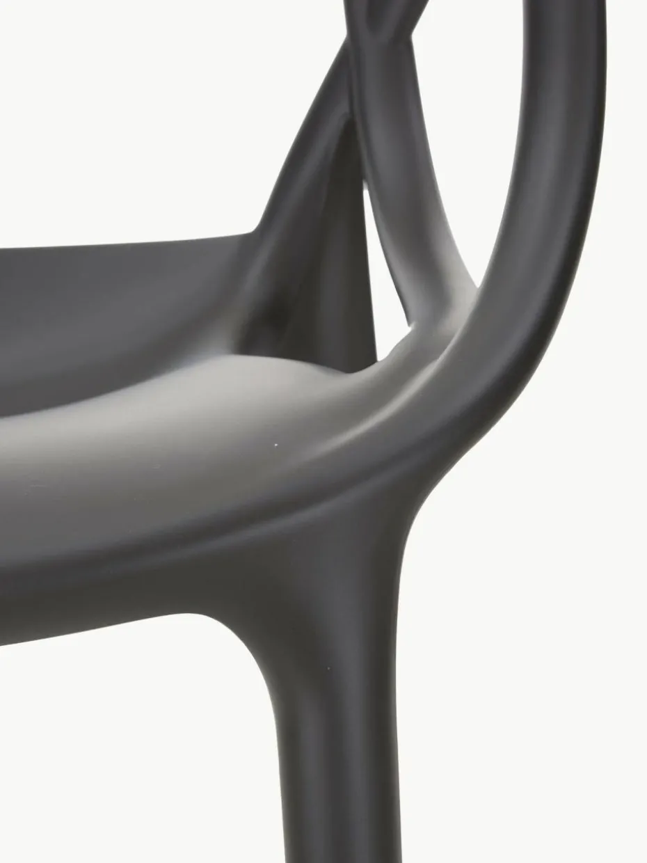 Masters von Kartell ist ein Zusammenspiel dreier Klassiker: die unverwechselbaren Silhouetten von Serie 7 von Arne Jacobsen, Tulip von Eero Saarinen und Eiffel von Charles Eames wurden hier von Philippe Starck & Eugeni Quitllet vereint und neu interpretiert. Ein besonderer Blickfang ist natürlich die Rückenlehne mit ihren originellen, kurvenreichen Linien, die fließend in die Sitzfläche übergehen.