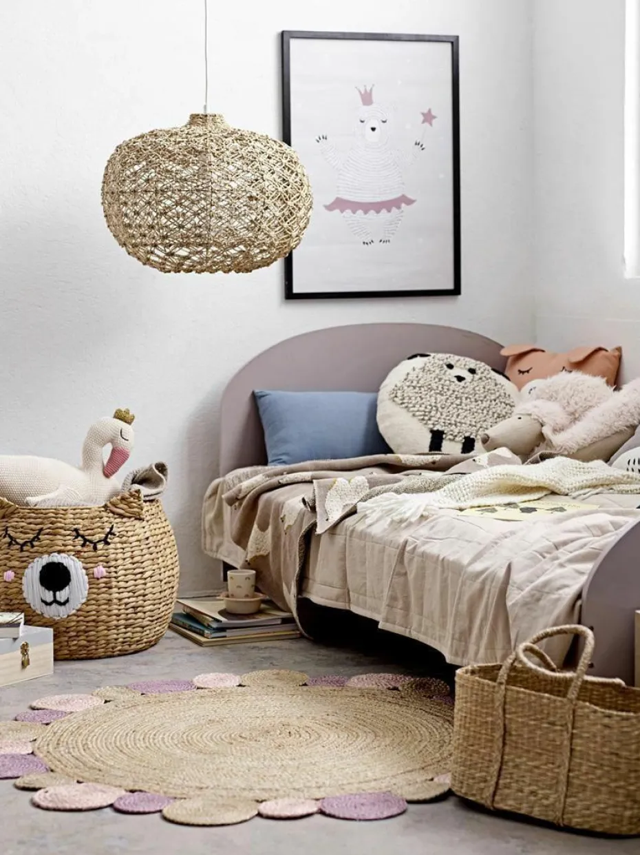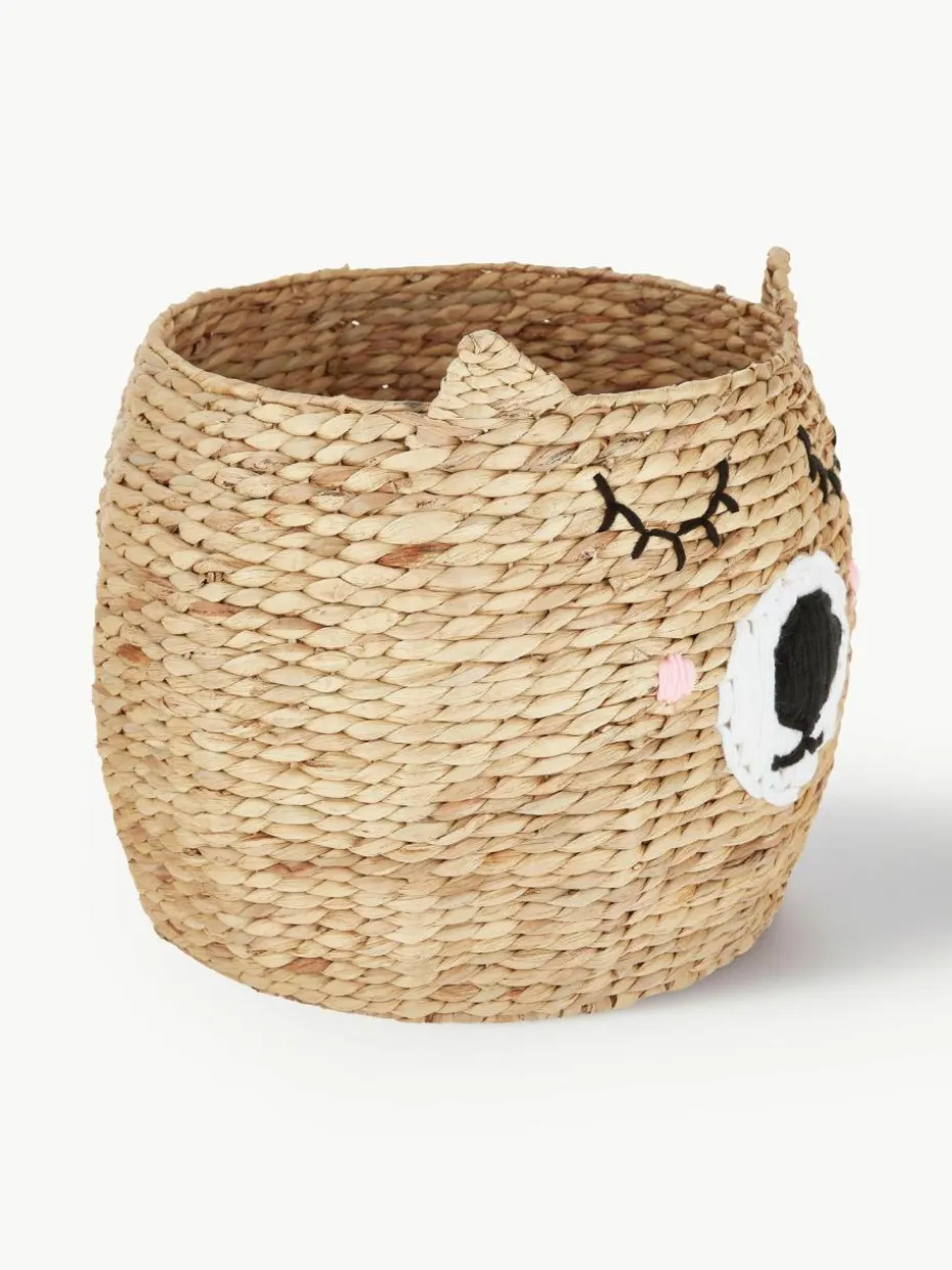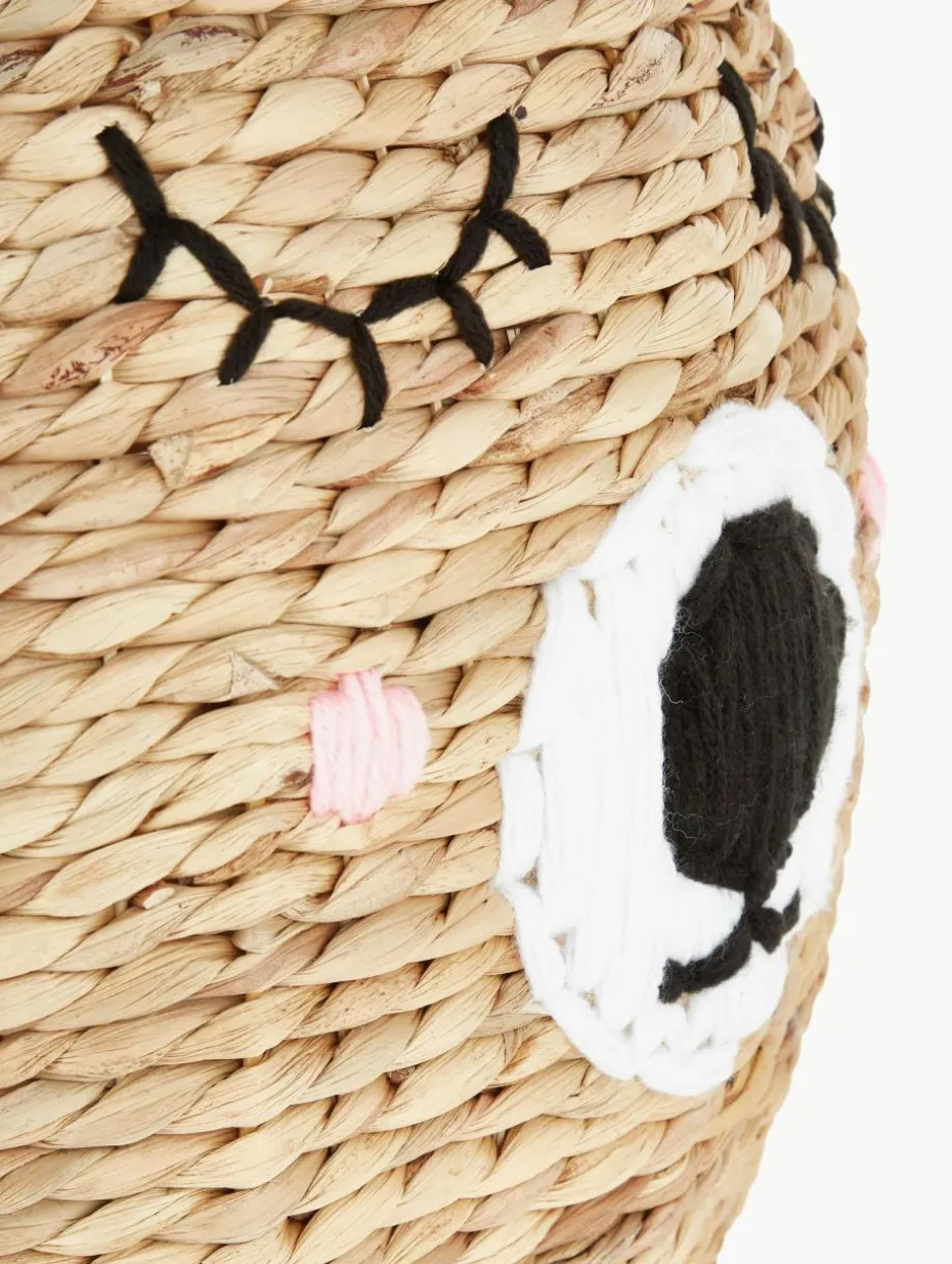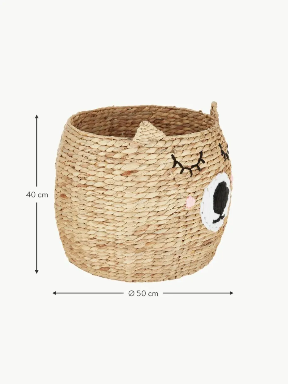 SLEEPY ist ein niedlicher Korb von Bloomingville MINI mit kleinen Ohren und einem gestickten Bärengesicht auf der Vorderseite. Er besteht aus Wasserhyazinthe und ist praktisch für alle Arten der Aufbewahrung.