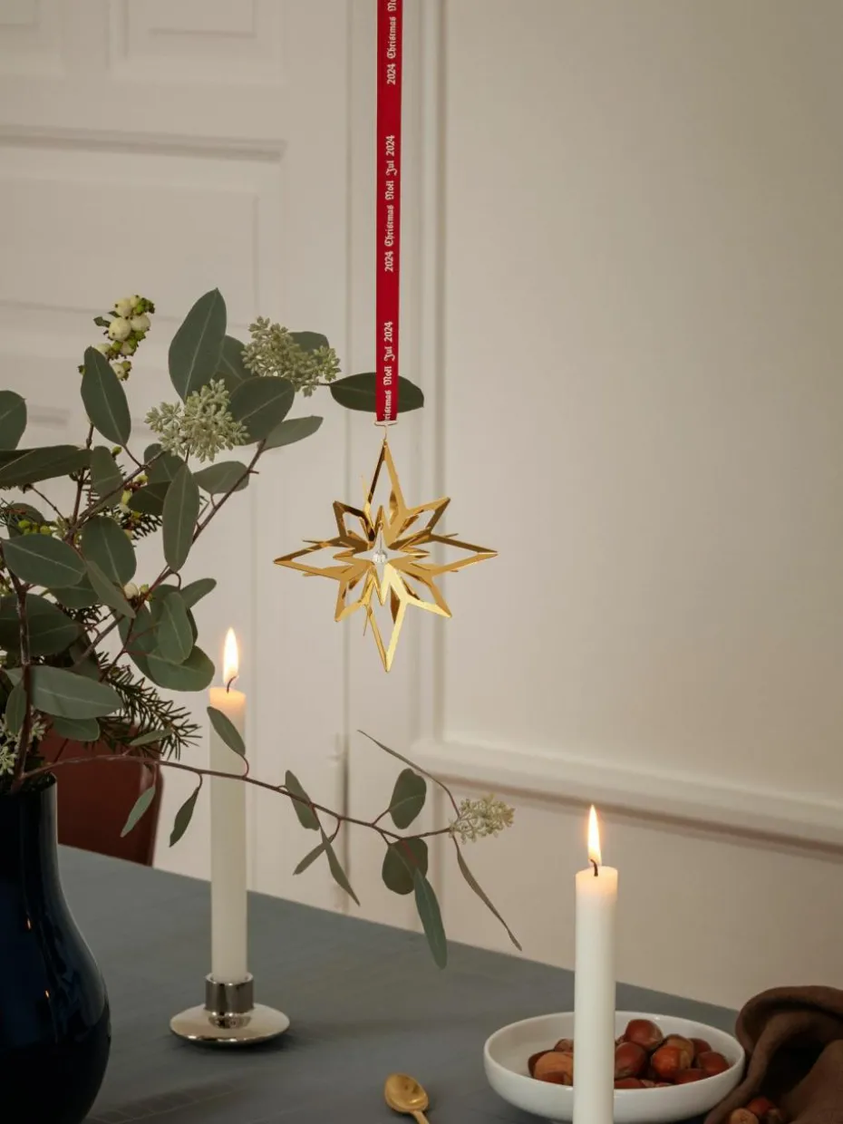 Der Baumanhänger verfügt über ein rotes Band mit dem Designjahr 2024 und ein blaues Band, das das Thema der Kollektion symbolisiert.
