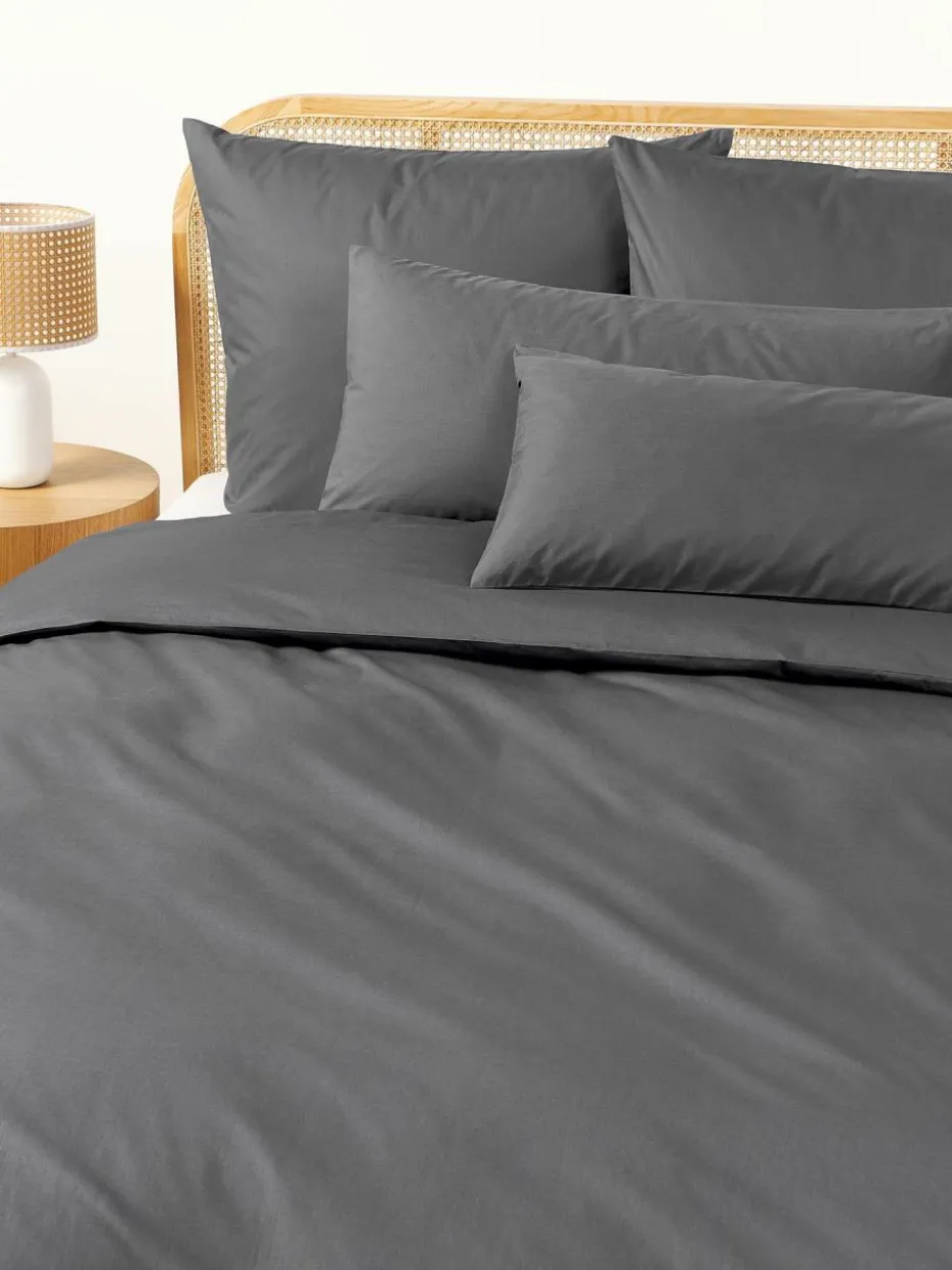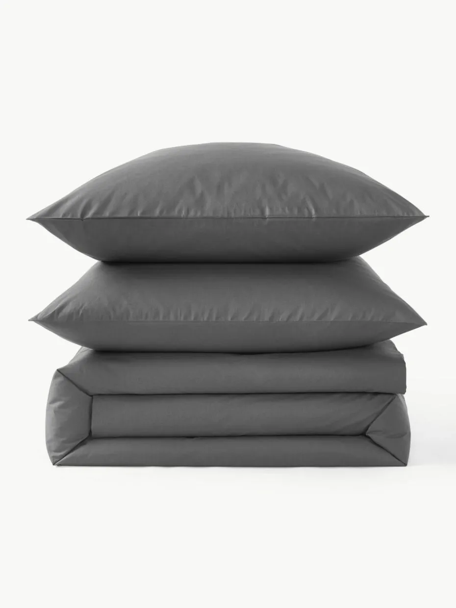 Der Baumwollperkal-Bettdeckenbezug verfügt über einen Knopfverschluss und wurde in Portugal gefertigt.