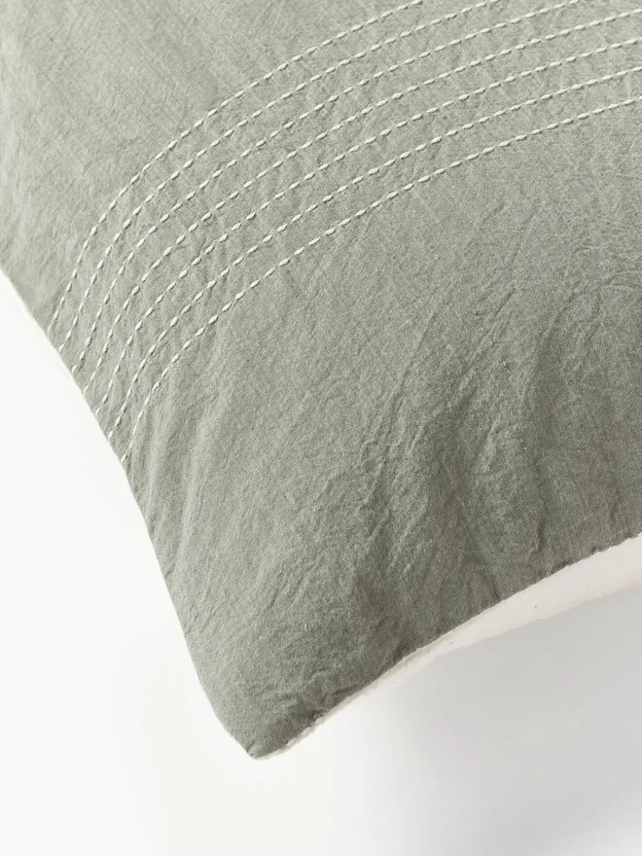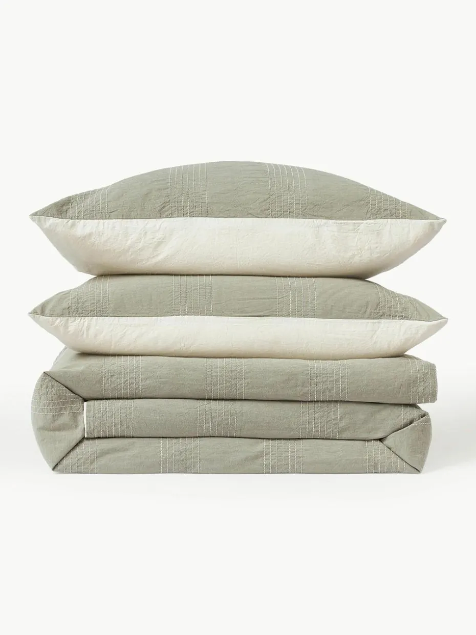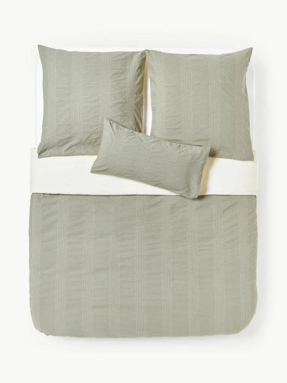 Der Baumwollperkal-Bettdeckenbezug mit gestreifter Vorderseite und unifarbener Rückseite verfügt über einen Knopfverschluss und wurde in Portugal gefertigt.