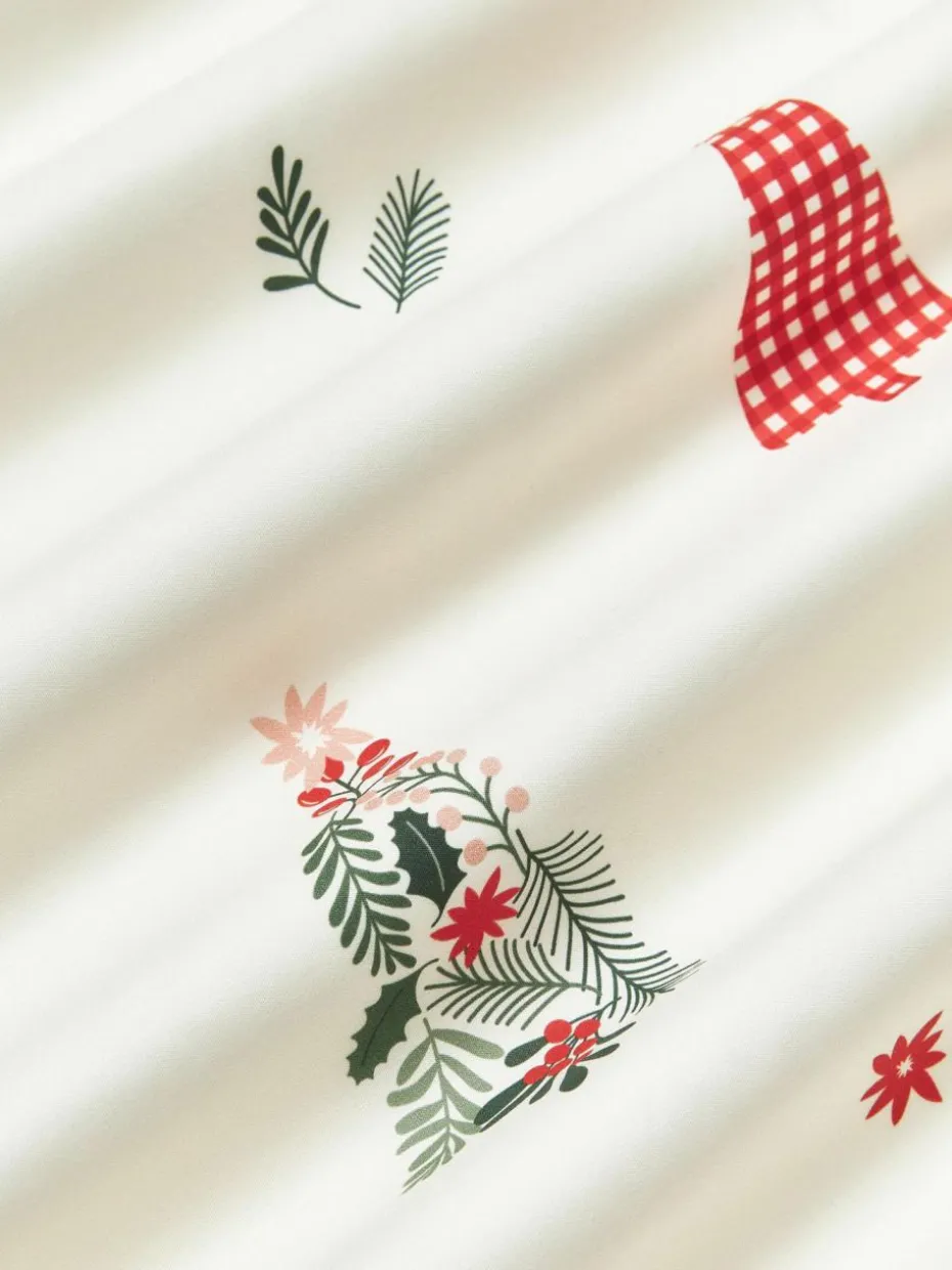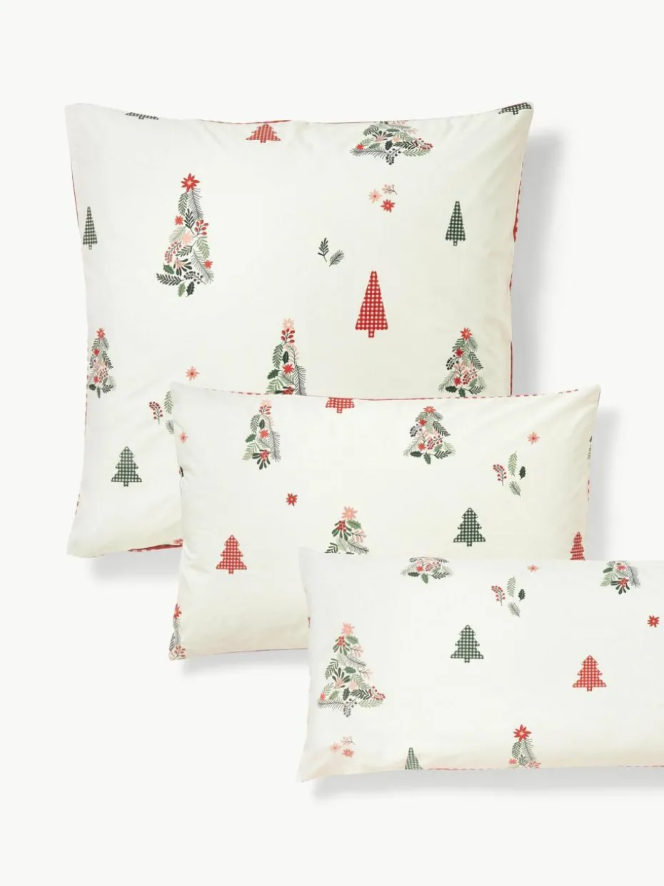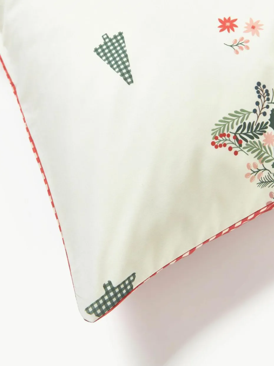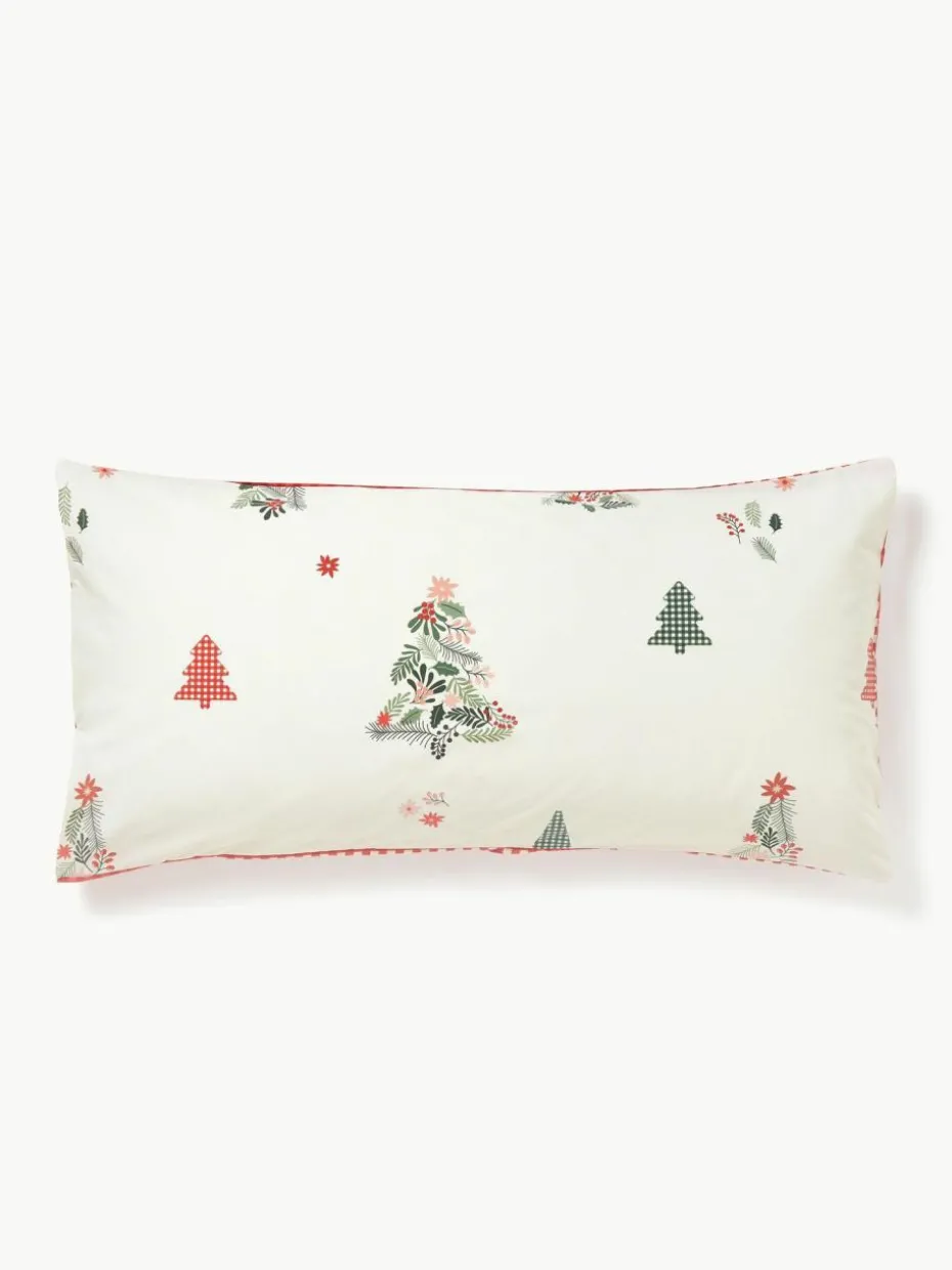 Der Kopfkissenbezug mit winterlichem Muster auf der Vorderseite und karierter Rückseite verfügt über einen Knopfverschluss und wurde in Portugal gefertigt.