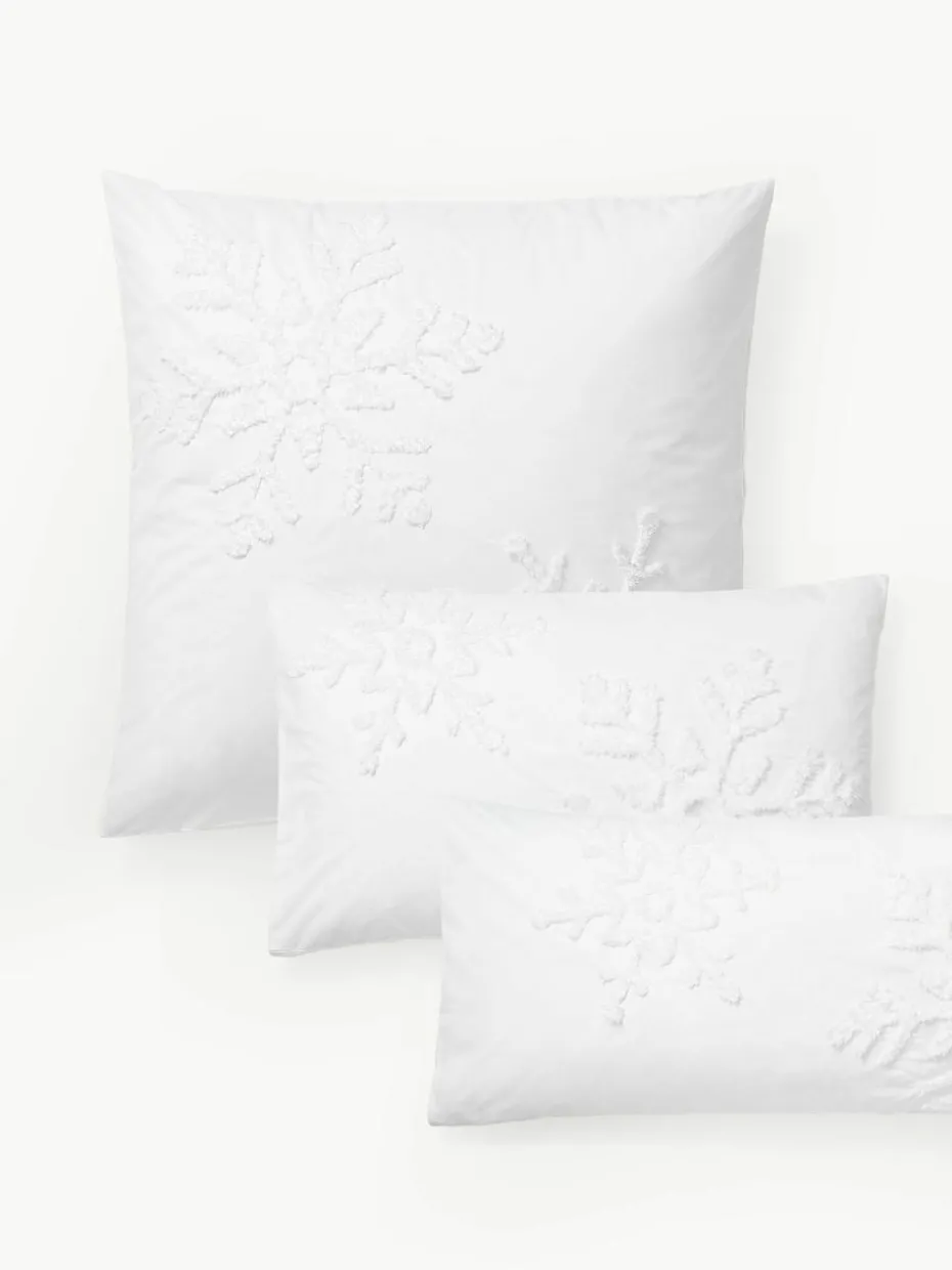 Der Baumwollperkal-Kissenbezug mit getuftetem Schneeflocken-Motiv verfügt über einen Knopfverschluss.