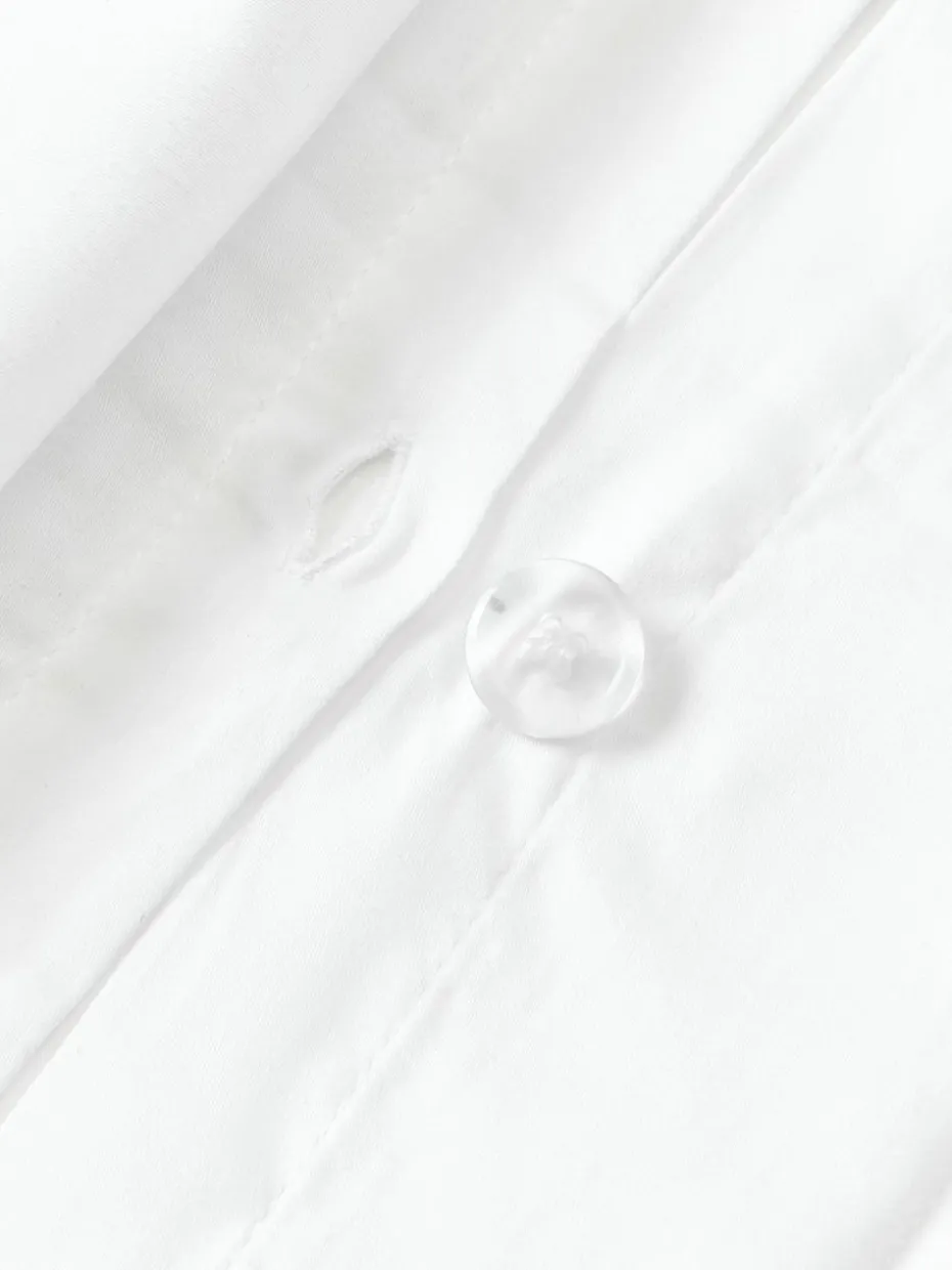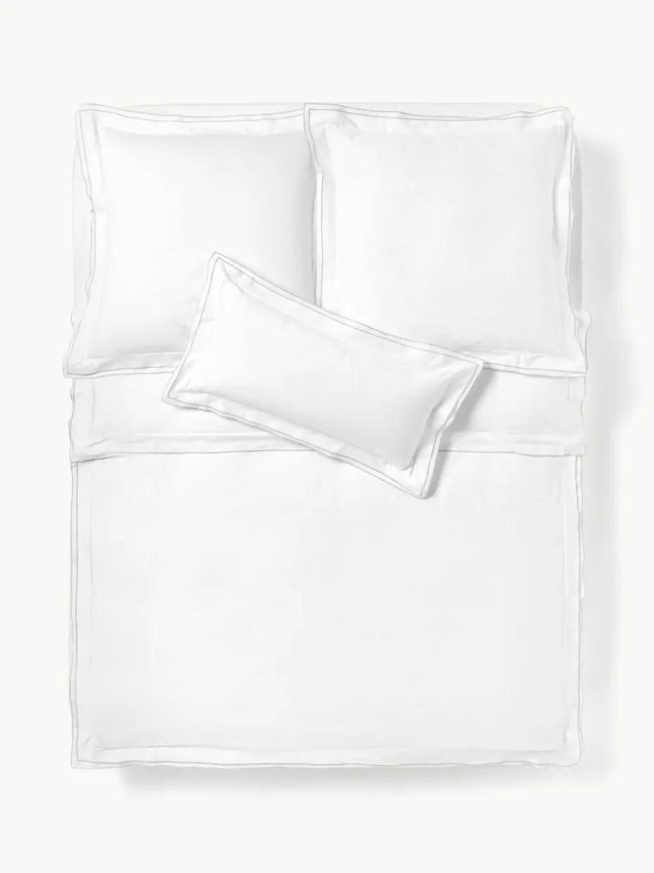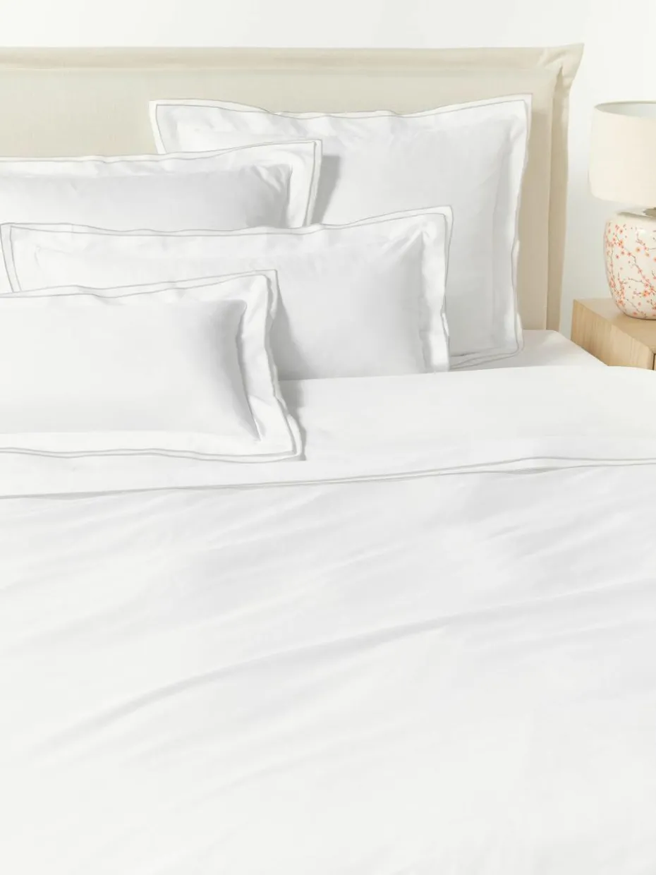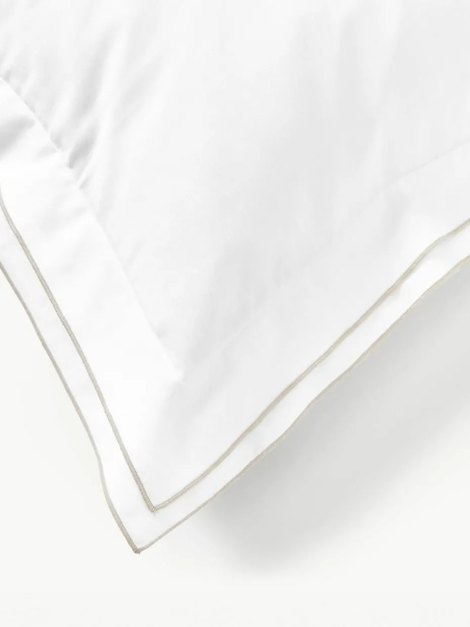 Der Baumwollsatin-Bettdeckenbezug mit Stehsaum und farblich abgesetzter Ziernaht verfügt über einen Hotelverschluss und wurde in Portugal gefertigt.