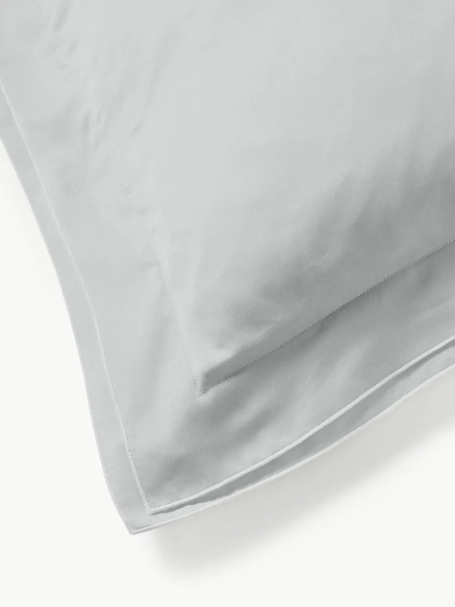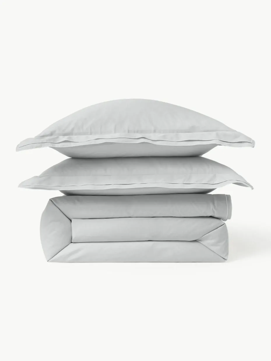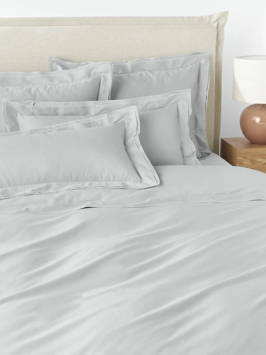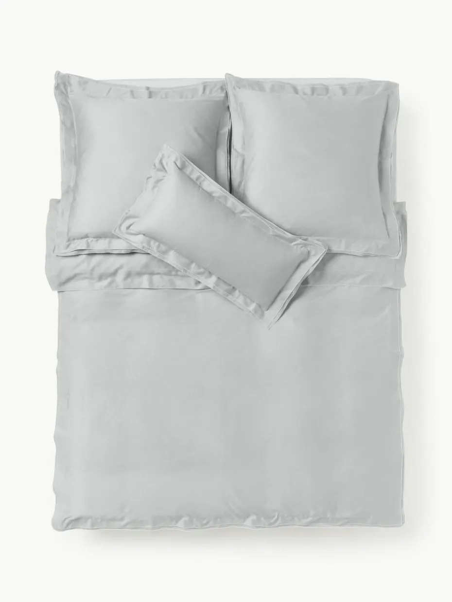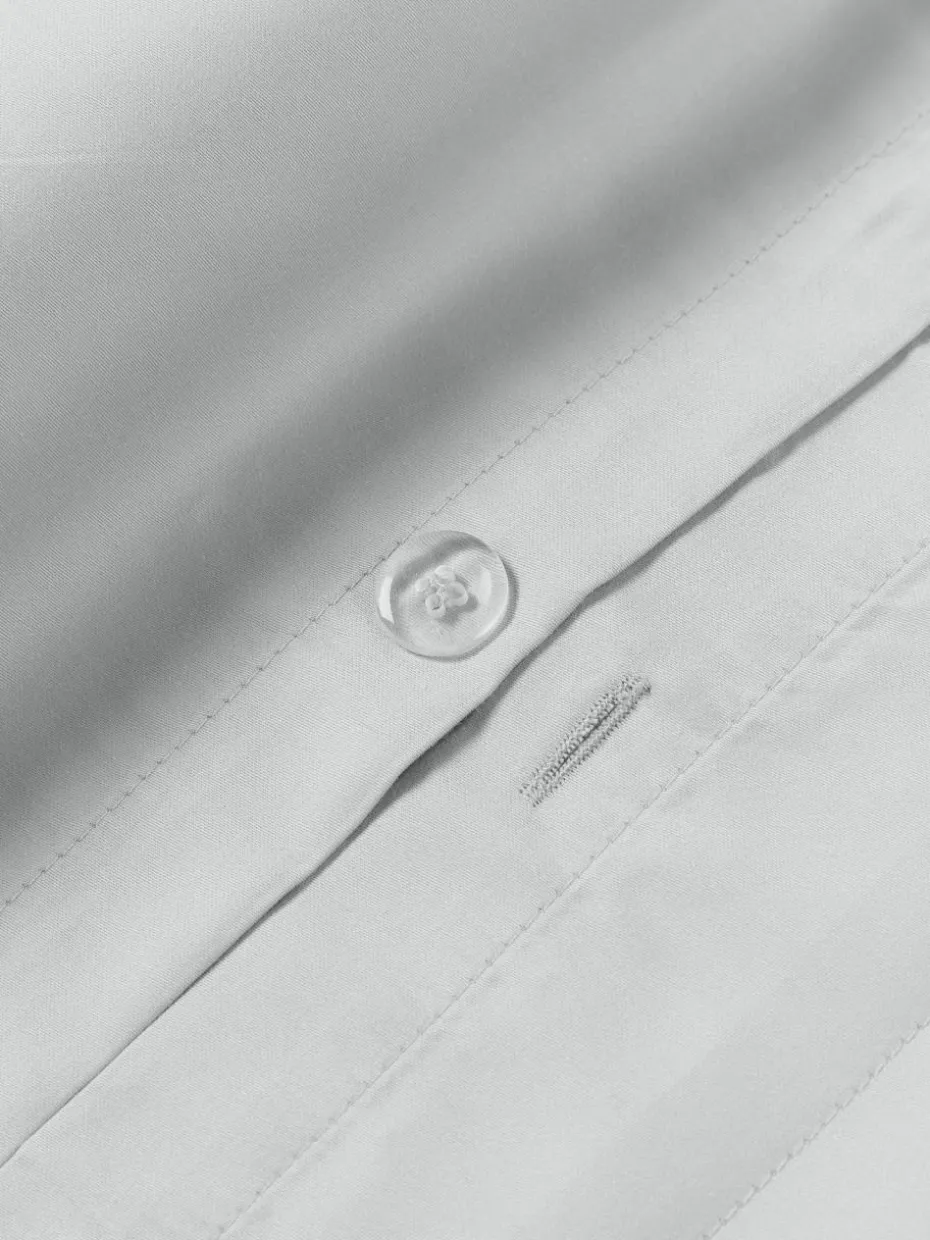 Der Baumwollsatin-Bettdeckenbezug mit Stehsaum und farblich abgesetzter Ziernaht verfügt über einen Knopfverschluss und wurde in Portugal gefertigt.
