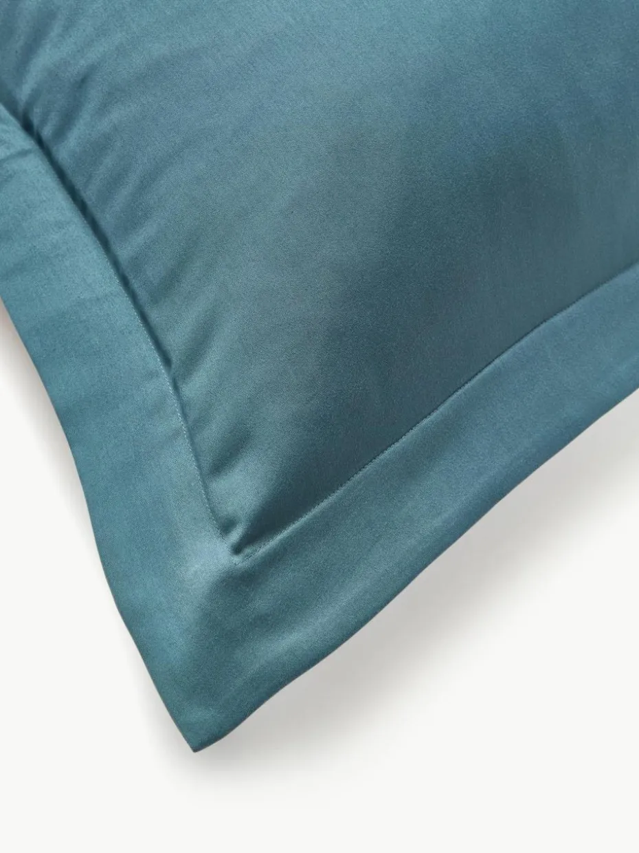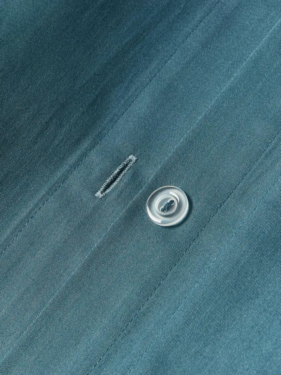 Der Baumwollsatin-Bettdeckenbezug im Japandi Style verfügt über einen Knopfverschluss.