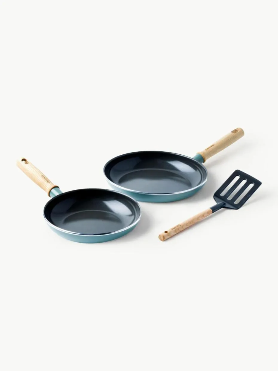 Dieses dreiteilige Set besteht aus zwei Bratpfannen in verschiedenen Größen und einer Pfannenschaufel. Die Bratpfannen verfügen über eine Antihaftbeschichtung. Dies erleichtert die Handhabung und Reinigung. Zudem sind die Bratpfannen für alle Herdarten inklusive Induktion geeignet.“,“pdp_care_label“:“Von Hand spülen