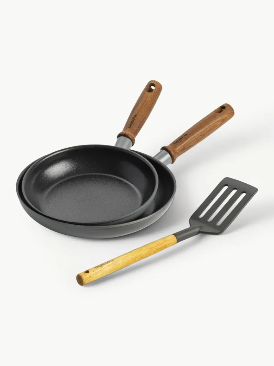 Dieses dreiteilige Set besteht aus zwei Bratpfannen in verschiedenen Größen und einer Pfannenschaufel. Die Bratpfannen verfügen über eine Antihaftbeschichtung. Dies erleichtert die Handhabung und Reinigung. Zudem sind die Bratpfannen für alle Herdarten inklusive Induktion geeignet.“,“pdp_care_label“:“Von Hand spülen