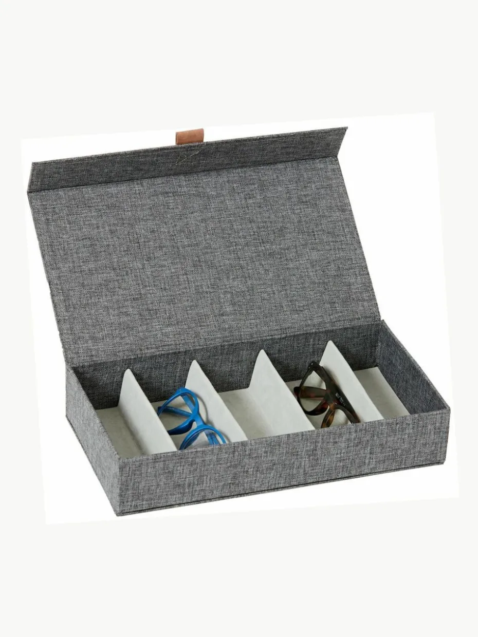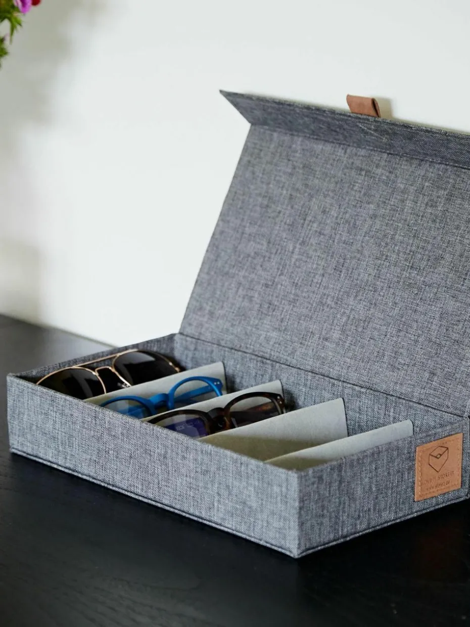 Das Aufbewahrungs-Brillenbox bietet eine hochwertige Lösung zur Aufbewahrung Deiner Brillen und Sonnenbrillen. Die Fächer im Inneren sind mit einem Samtstoff ausgekleidet um Deine Brillen bestmöglich zu schützen. Die Brillenbox bietet insgesamt fünf Fächer zur Aufbewahrung. Die Brillenbox kann durch einen eingenähten Magneten an der Vorderseite leicht geöffnet und geschlossen werden.
