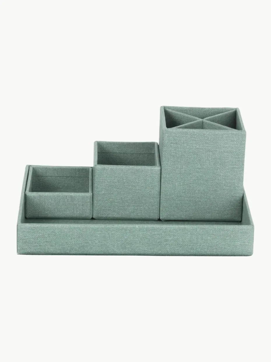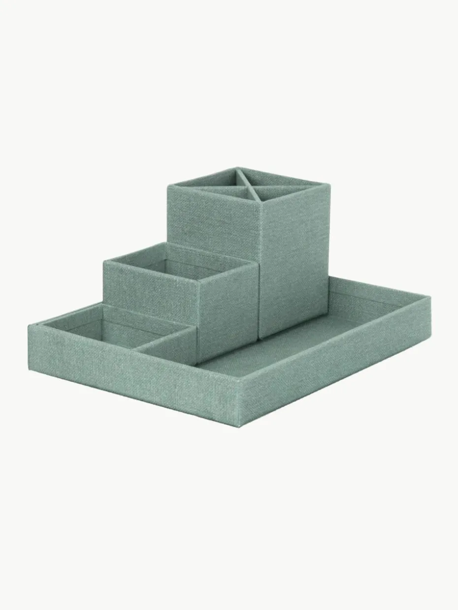 Das vierteilige Büro-Organizer-Set besteht aus drei unterschiedlichen Aufbewahrungs-Organizern und einem Tablett und kann beliebig ineinander gestellt und kombiniert werden.