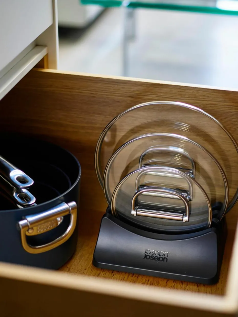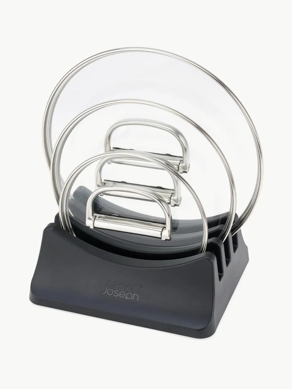 Dieser clevere Pfannendeckelständer wurde speziell für Joseph Joseph Space Kochgeschirrdeckel entwickelt. Mit seinem stabilen Sockel und den rutschfesten Füßen kann er bis zu drei Glasdeckel verschiedener Größen sicher aufbewahren, sodass die Schubladen organisiert bleiben und Du genau den richtigen Deckel findest.