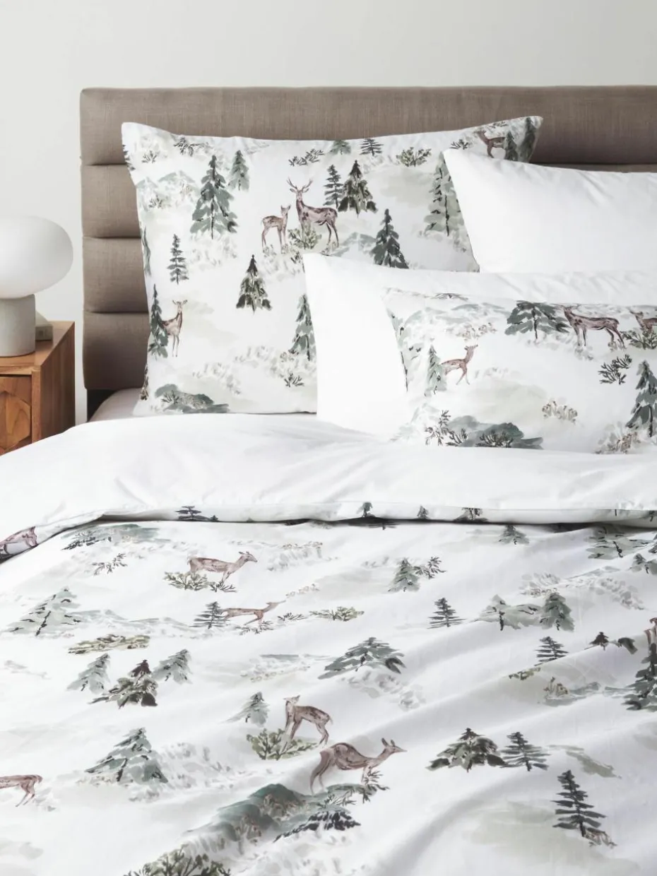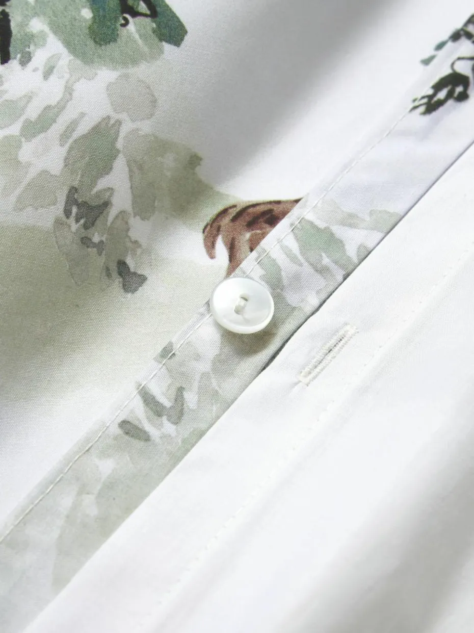 Der Baumwollperkal-Bettdeckenbezug mit grafischem Muster verfügt über einen Knopfverschluss.