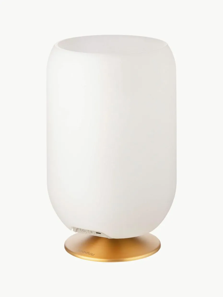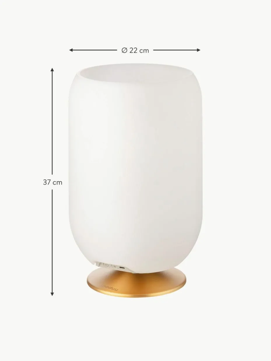 Die LED-Tischlampe Atmos ist ein Bluetooth-Lautsprecher, eine Lampe und ein Getränkehalter in einem. Seine kleine und praktische Form bietet Platz für zwei normale Weinflaschen und gibt warmes, dimmbares Licht und klaren Klang ab.