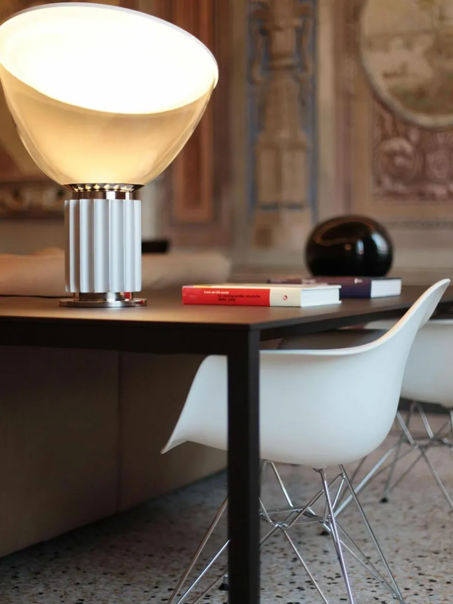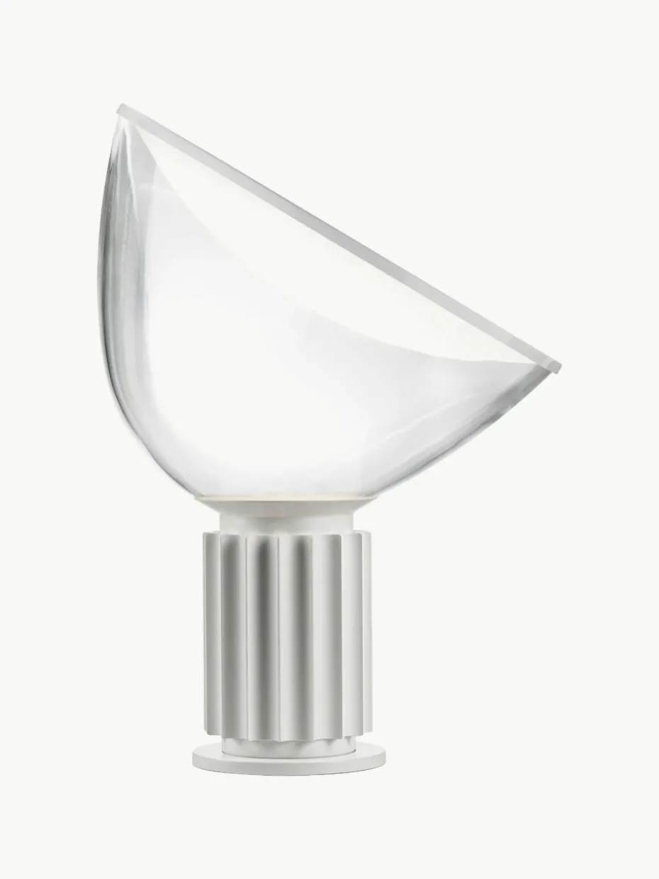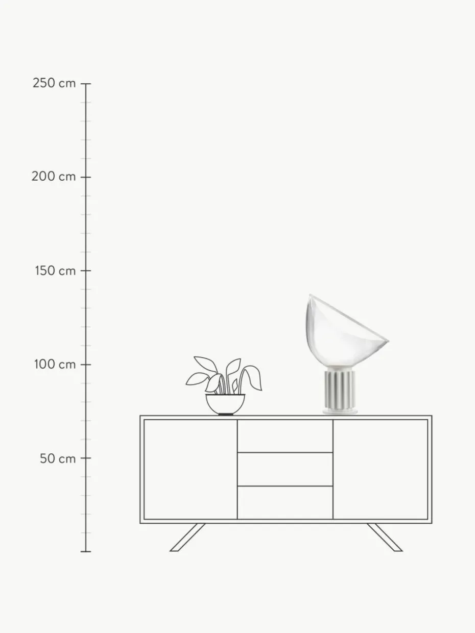 Die TACCIA LED Tischleuchte – Das Original aus Glas! Entworfen von Achille und Pier Giacomo Castiglioni, ist TACCIA ein zeitloses Designobjekt in seiner originalen Ausführung mit einem Schirm aus mundgeblasenem Glas. Die Kombination aus hochwertigem Glas und Chromdetails verleiht der Leuchte einen stilvollen, industriellen Charakter. Mit indirekt reflektiertem Licht schafft TACCIA eine warme, angenehme Atmosphäre. Dank moderner LED-Technik bleibt die ursprüngliche Designidee der Castiglioni-Brüder lebendig – ein Meisterwerk, das Ästhetik und Funktionalität perfekt vereint.