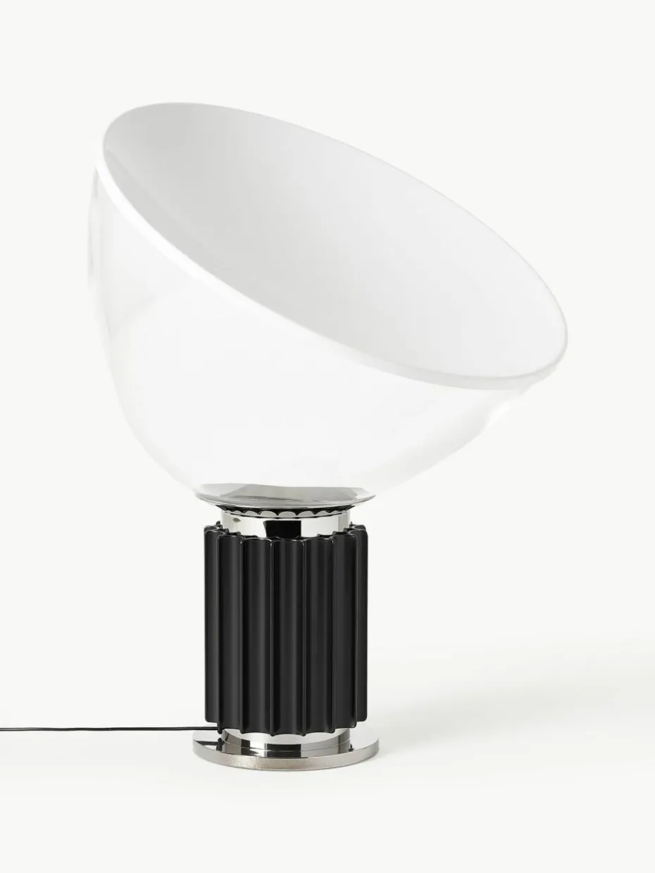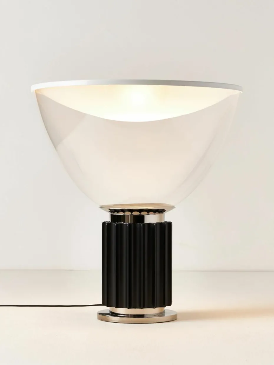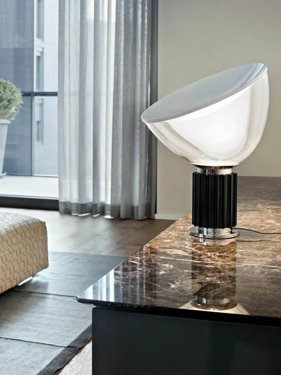TACCIA, entworfen von den Designern Achille und Pier Giacomo Castiglioni, ist ebenso modern wie stilvoll. Hergestellt aus mundgeblasenem Glas und Chrom, versprüht TACCIA einen Hauch von Industrie und verbreitet indirektes, reflektiertes Licht.