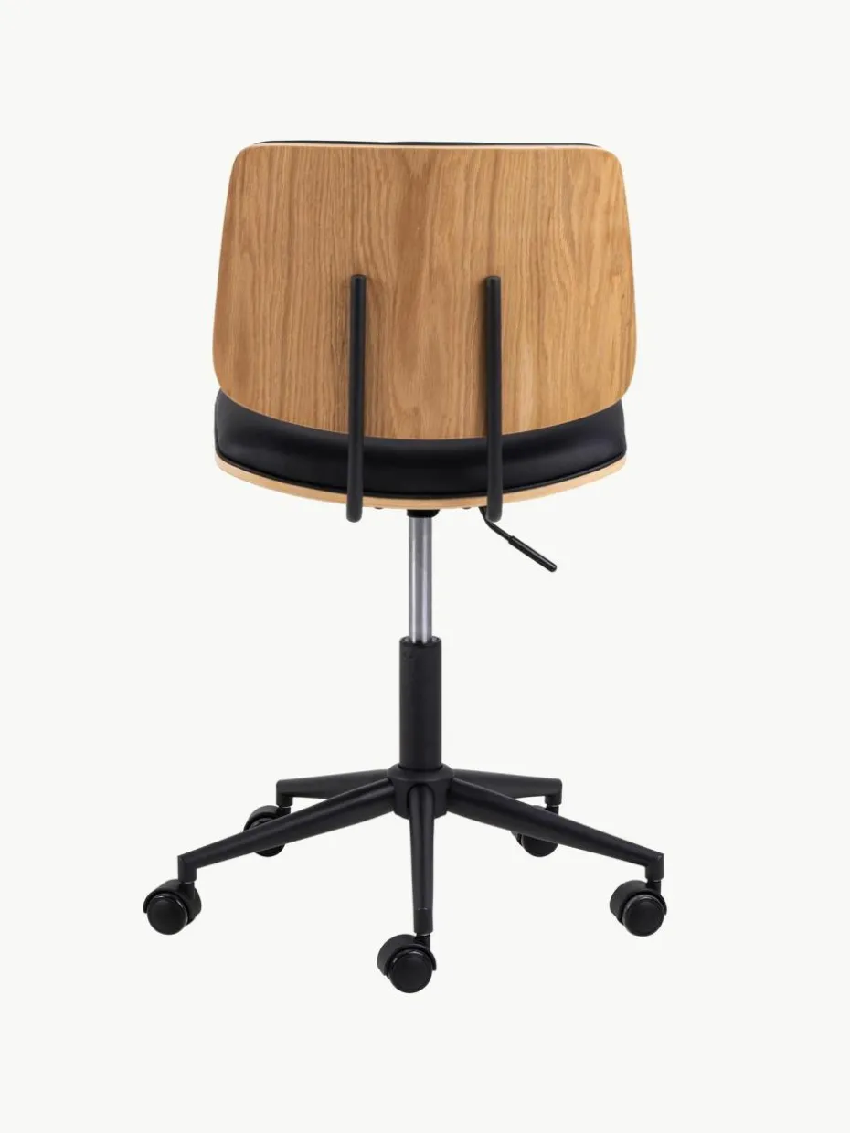 Mit diesem ausdrucksstarken, höhenverstellbaren Schreibtischstuhl verleihst Du Deinem Arbeitsbereich neuen Schwung. Sitz und Rückenlehne sind mit zwei schwarzen Stahlrohren verbunden und bestehen aus einem gebogenen, lackierten Eichenfurnier, das mit einer Schaumstoffschicht und schwarzem Kunstlederbezug für mehr Komfort ausgestattet ist.