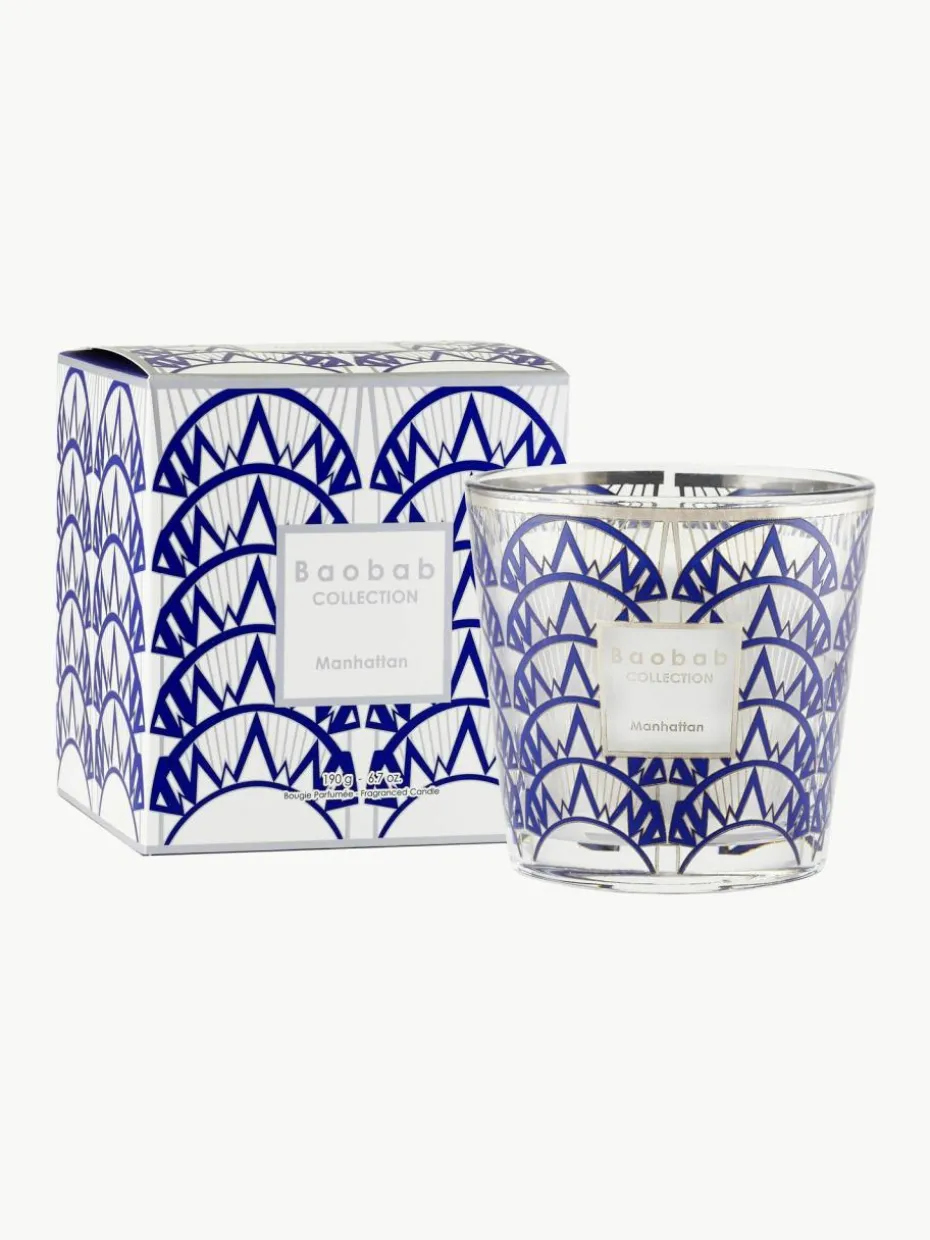 Die MANHATTAN Duftkerze wird in ein Glas gegossen, das mit einem blauen Siebdruck verziert ist, inspiriert von der Art-Déco-Architektur des Chrysler Buildings.