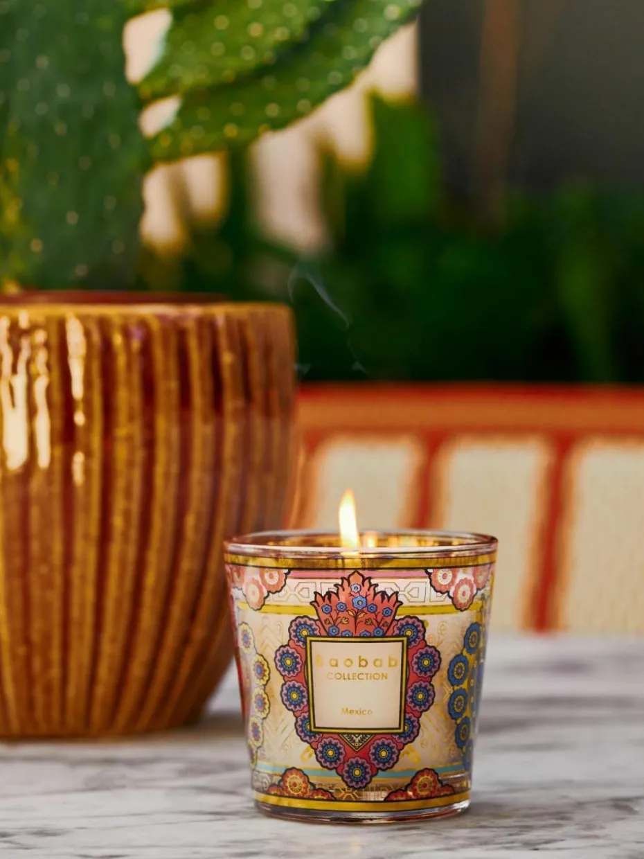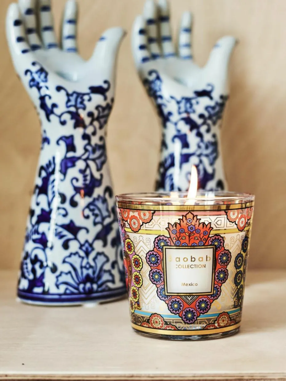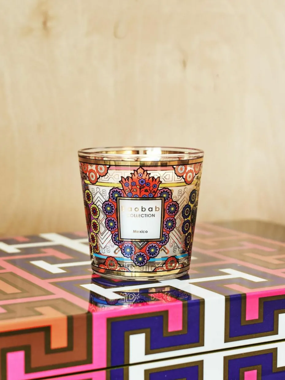 Das Glas der MEXICO Duftkerze ist mit einem farbigen und goldenen Siebdruck versehen, der ein Ex-Voto-Herz darstellt, ein kleines Objekt, das spirituell verwendet wird, um einen Wunsch zu äußern oder Dank für empfangene Gnade auszudrücken. Diese Herzmotive sind rund um das Glas platziert, und am unteren Rand bemerkt man ein dezentes Stickmuster, das an mexikanisches Handwerkkunst und an die Korsagen von Frida Kahlo erinnert.