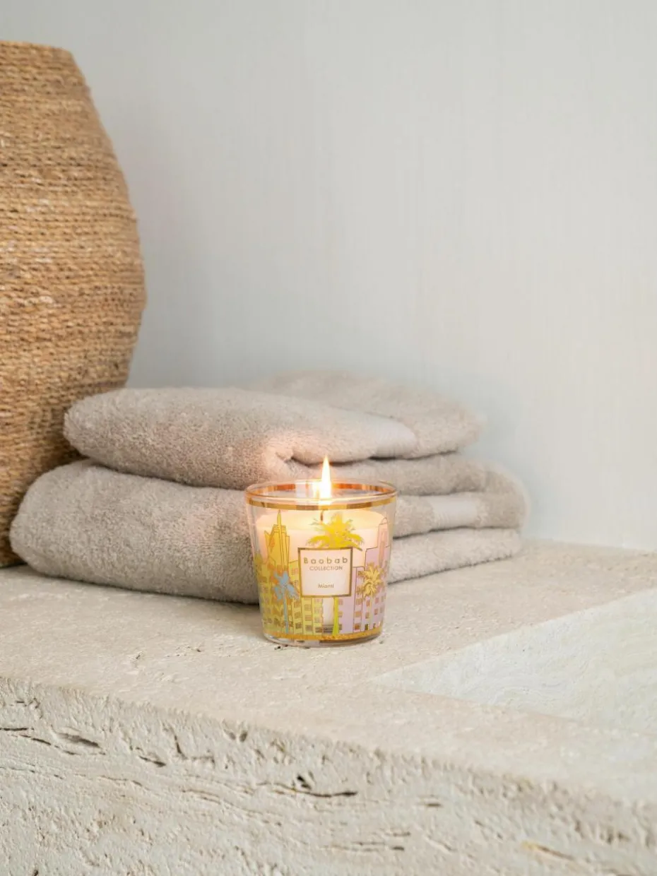 Die MIAMI Duftkerze ist mit einem pastellfarbenen Siebdruck verziert, der die Architektur der Art-Déco-Gebäude in South Beach nachahmt.