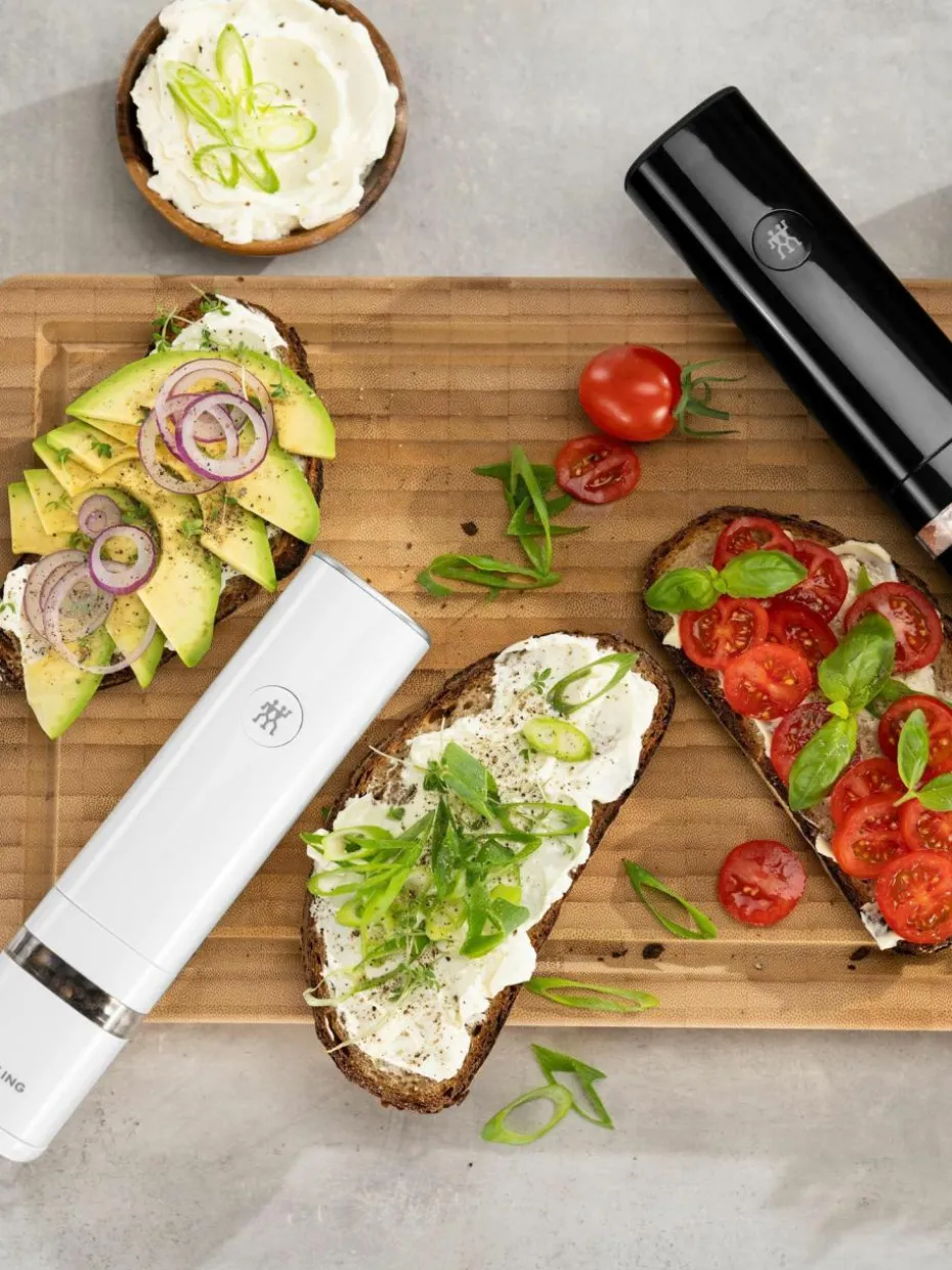 Mit den zwei ZWILLING ENFINIGY Gewürzmühlen in Schwarz und Weiß kann mühelos Salz und Pfeffer für frische Gerichte gemahlt werden. Ermöglicht wird das durch das hochwertige Keramikmahlwerk, wobei der Mahlgrad kann von fein bis grob eingestellt werden kann. Das umlaufende Sichtfenster ermöglicht jederzeit einen Blick auf den Füllstand der Mühlen und die integrierte LED-Beleuchtung, die sich bei jedem Mahlvorgang einschaltet, sorgt dafür, dass auch bei schwierigen Lichtverhältnissen überprüft werden kann, wieviel Salz oder Pfeffer bereits gemahlen wurden.