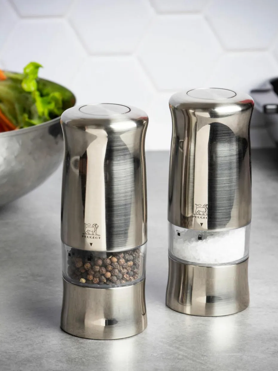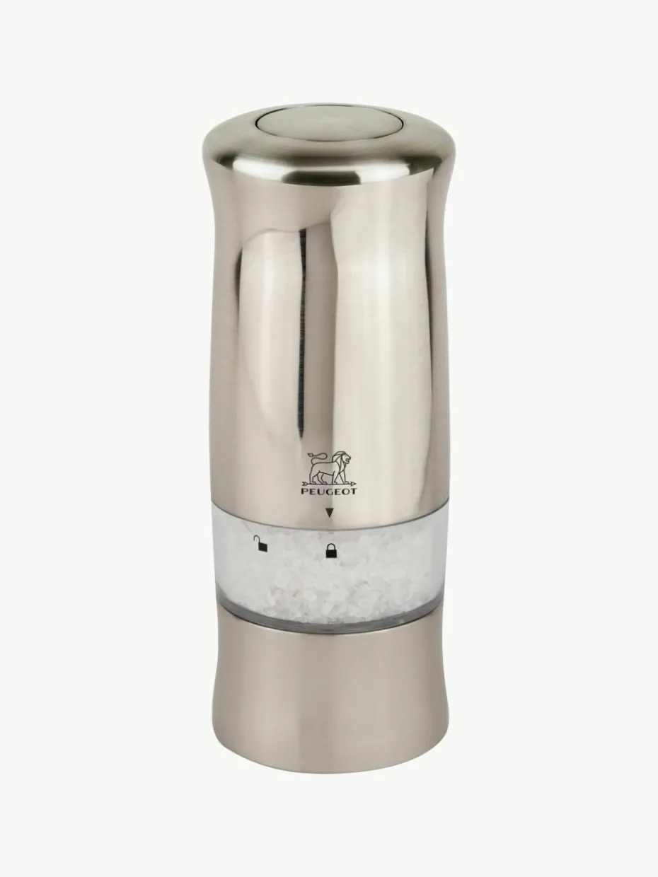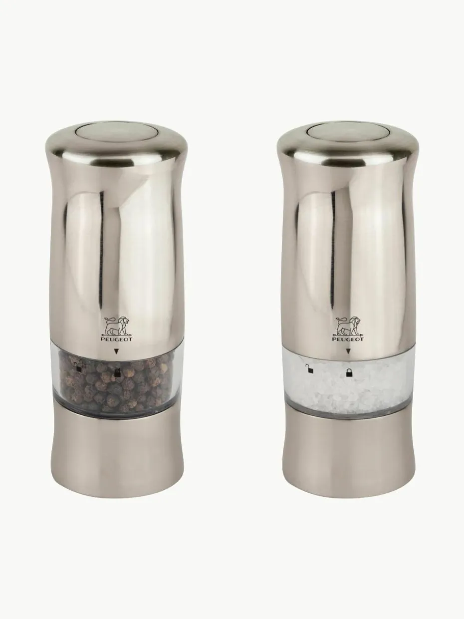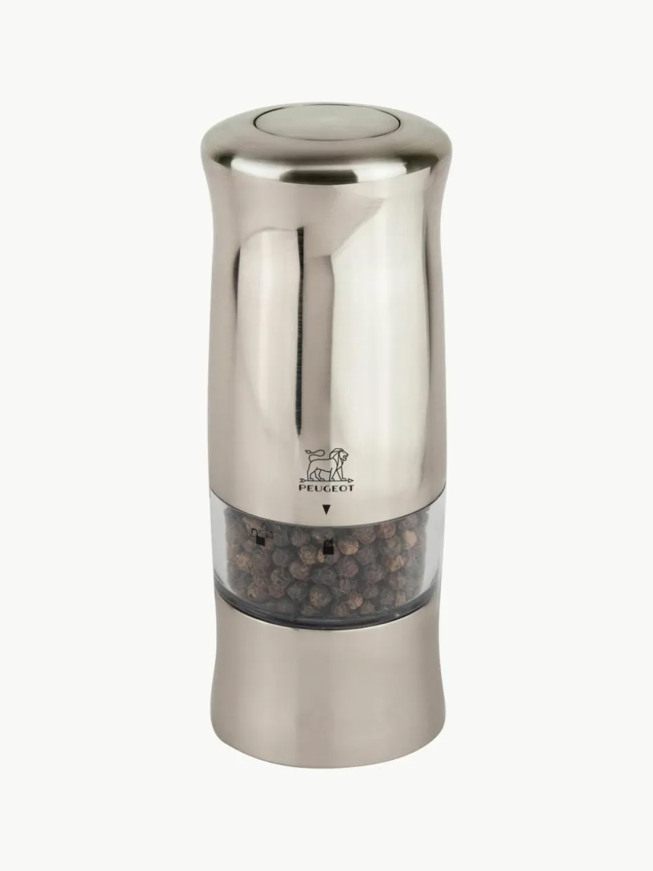 Das elektrische Mühlenduo ZELI für Pfeffer und Salz zeichnet sich durch den hochmodernen Look in gebürstetem Metall aus. Diese praktischen Hochleistungsmühlen können einhändig bedient werden. Ein Druck auf den Knopf oben auf der Mühle reicht aus, um sie auszulösen. Beim Gebrauch leuchtet ein Lämpchen auf, mit dem die Pfeffer- oder Salzabgabe kontrolliert werden kann. Angeboten wird das Set mit sechs Batterien, einem Ersatzlämpchen sowie einem Nachfüllbehälter aus schwarzem Vietnam-Pfeffer und Trockensalzkristallen. Der Pfeffermahlgrad kann mit einem Rädchen unter dem Mahlwerk der elektrischen ZELI Pfeffermühle eingestellt werden.