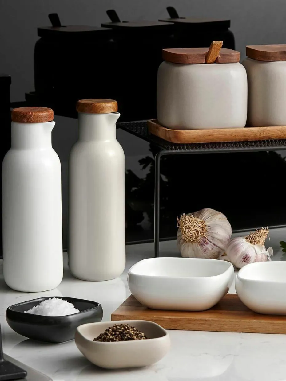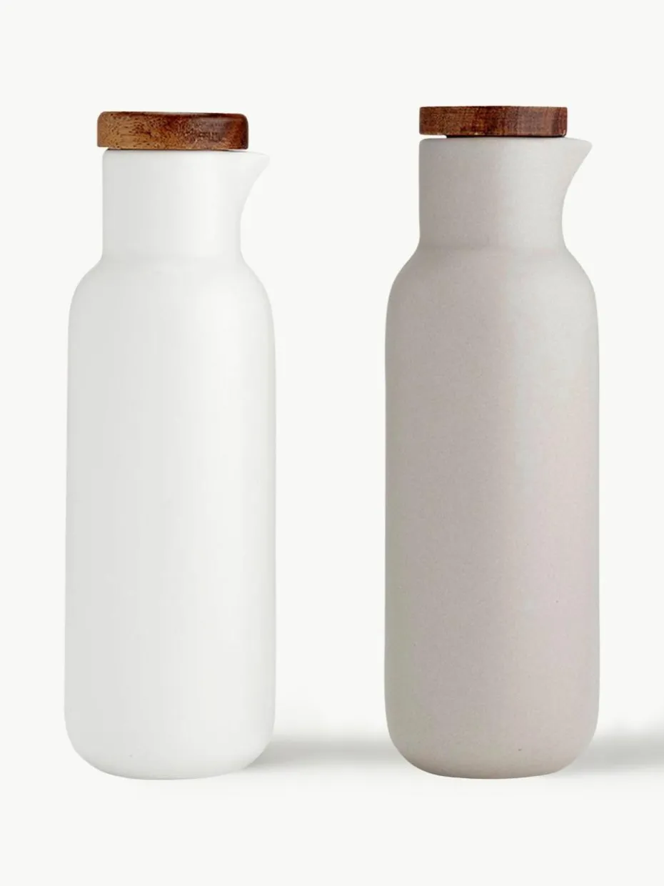 Essig- und Öl-Spender Essentials aus Porzellan und Akazienholz, 2er-Set