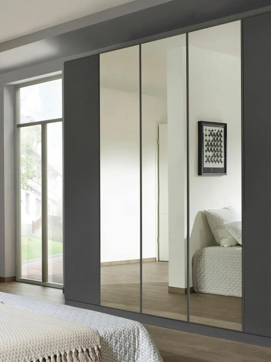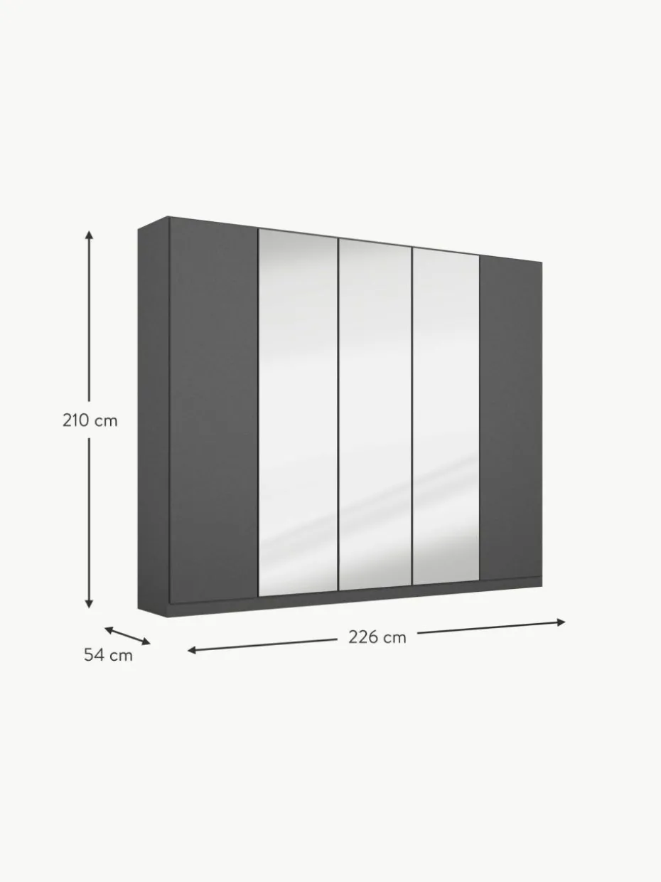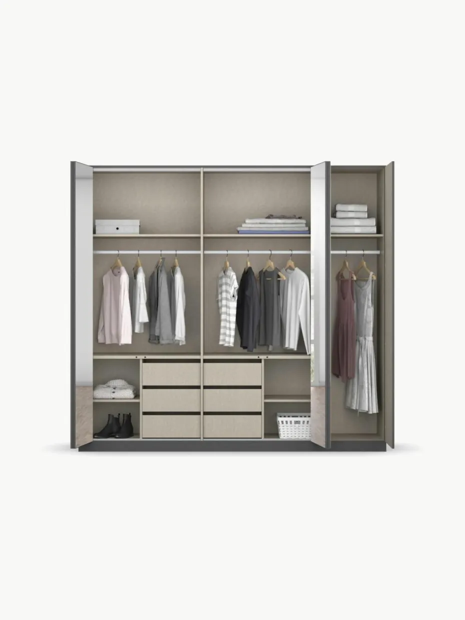 Ausgestattet mit Regalböden, Kleiderstangen und Schubkasteneinsätzen entsteht eine durchdachte Stauraumlösung für verschiedenste Ansprüche zum Aufbewahren, Organisieren und Strukturieren. Wingview überzeugt allerdings nicht nur im geöffneten Zustand – die praktischen Spiegelelemente auf der Schrankfront sorgen für optische Weite und ermöglichen dir nach dem Öffnen der Türen einen perfekten Rundumblick und Outfitcheck.