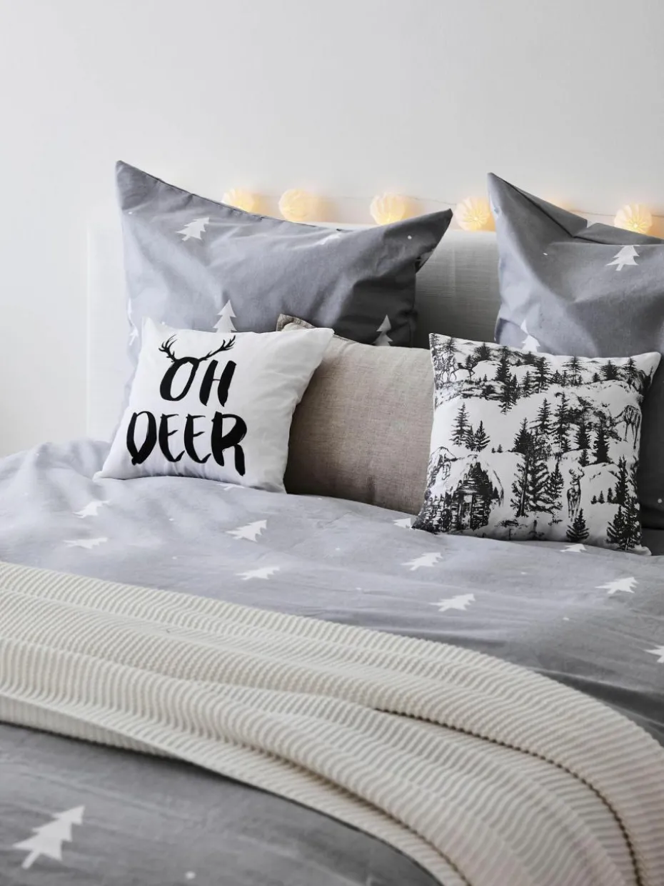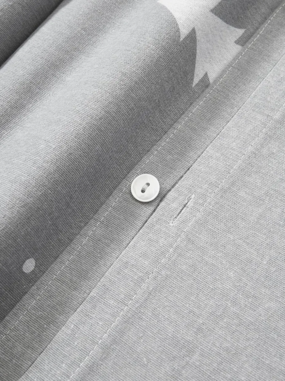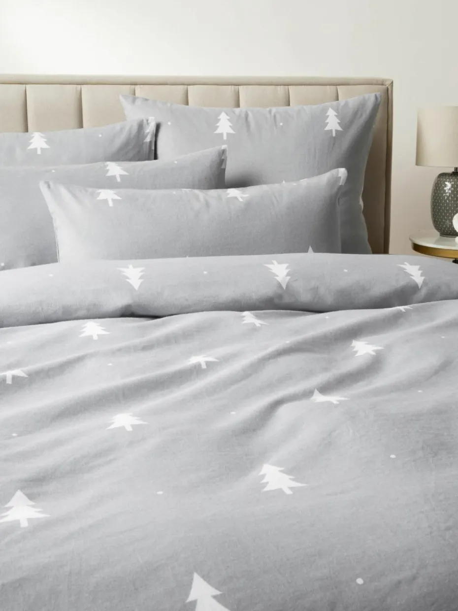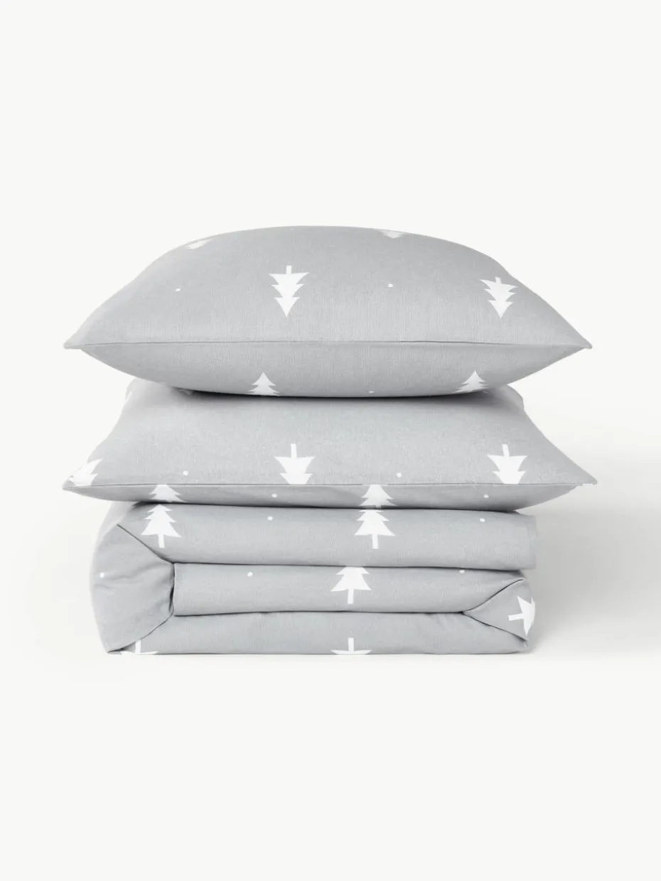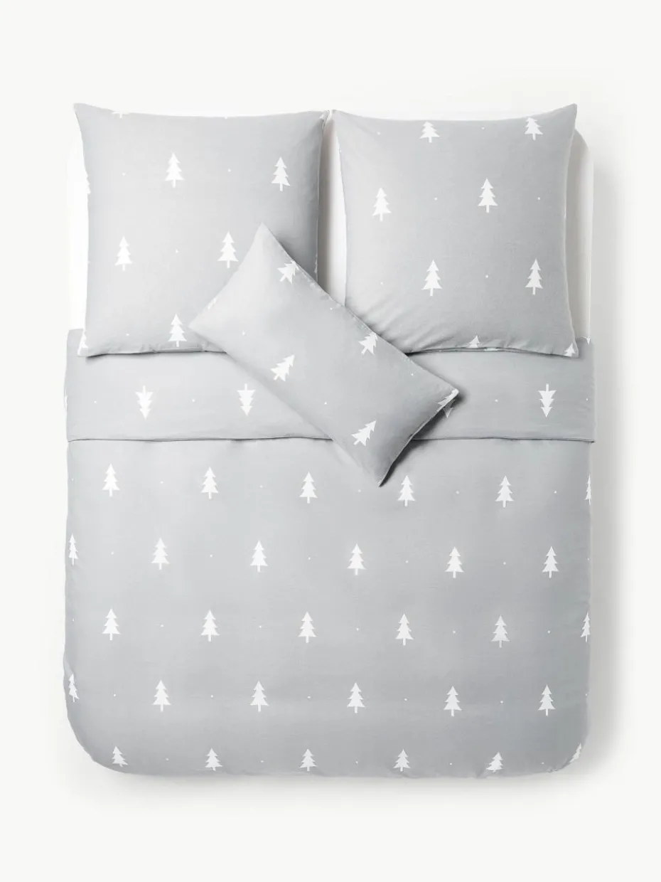 Der Bettdeckenbezug mit Weihnachtsbäumen sorgt für einen modernen, winterlichen Look im Schlafzimmer und passt problemlos in jedes Zuhause. Er verfügt über einen Knopfverschluss und wurde in Portugal gefertigt.