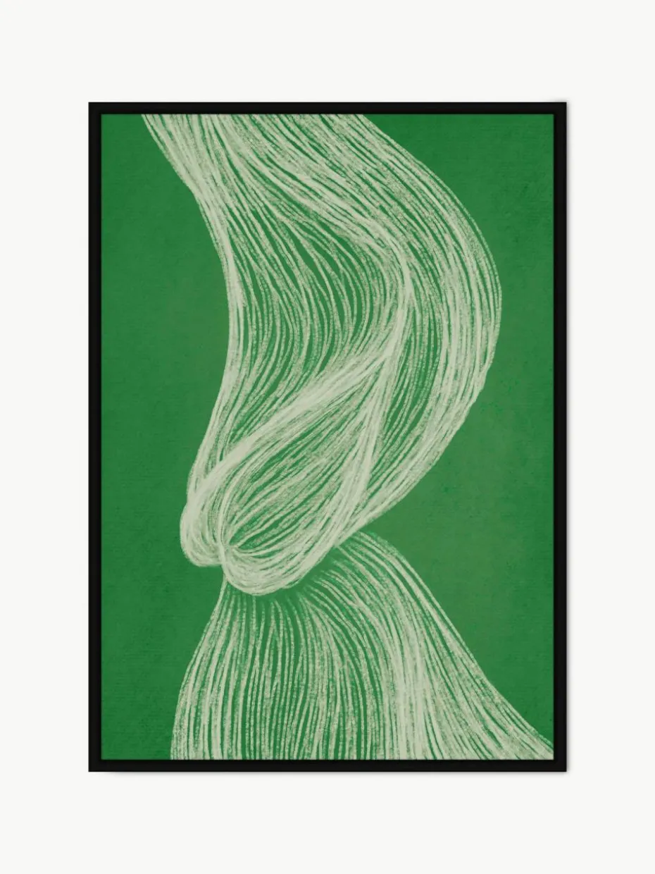 Farbenfrohes und abstraktes Poster mit einem Motiv aus fließenden Formen in Grüntönen. Eine beruhigende Kombination aus Linien und Kontrasten, die den Geist zu sanften Bewegungen in schönen Farben lenkt.