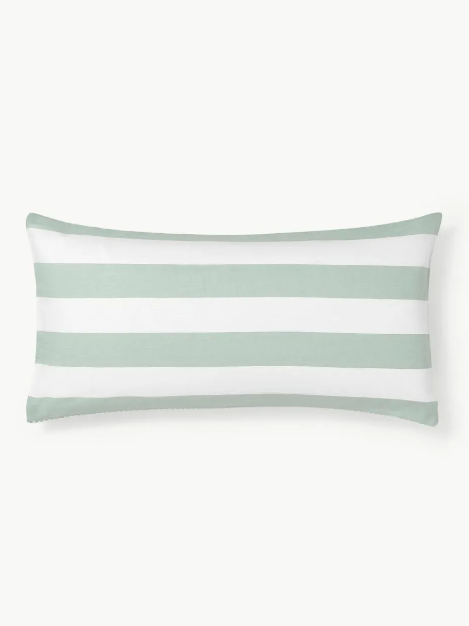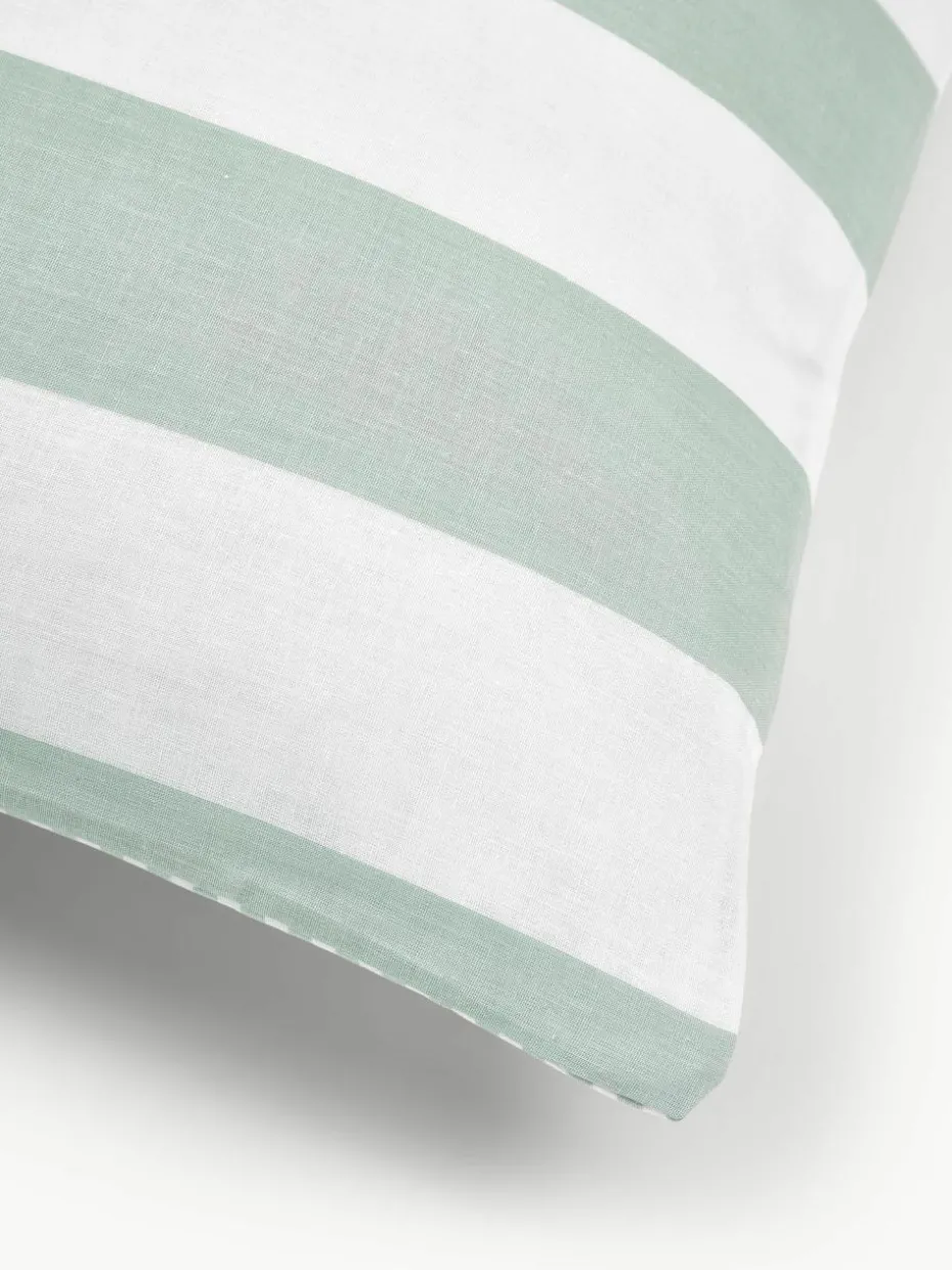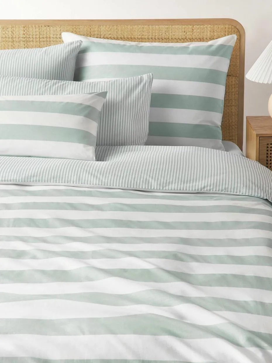 Der Baumwoll-Wendebettdeckenbezug sorgt für den modernen Look im Schlafzimmer: Die Vorderseite mit breiten Querstreifen, die Rückseite fein gestreift.