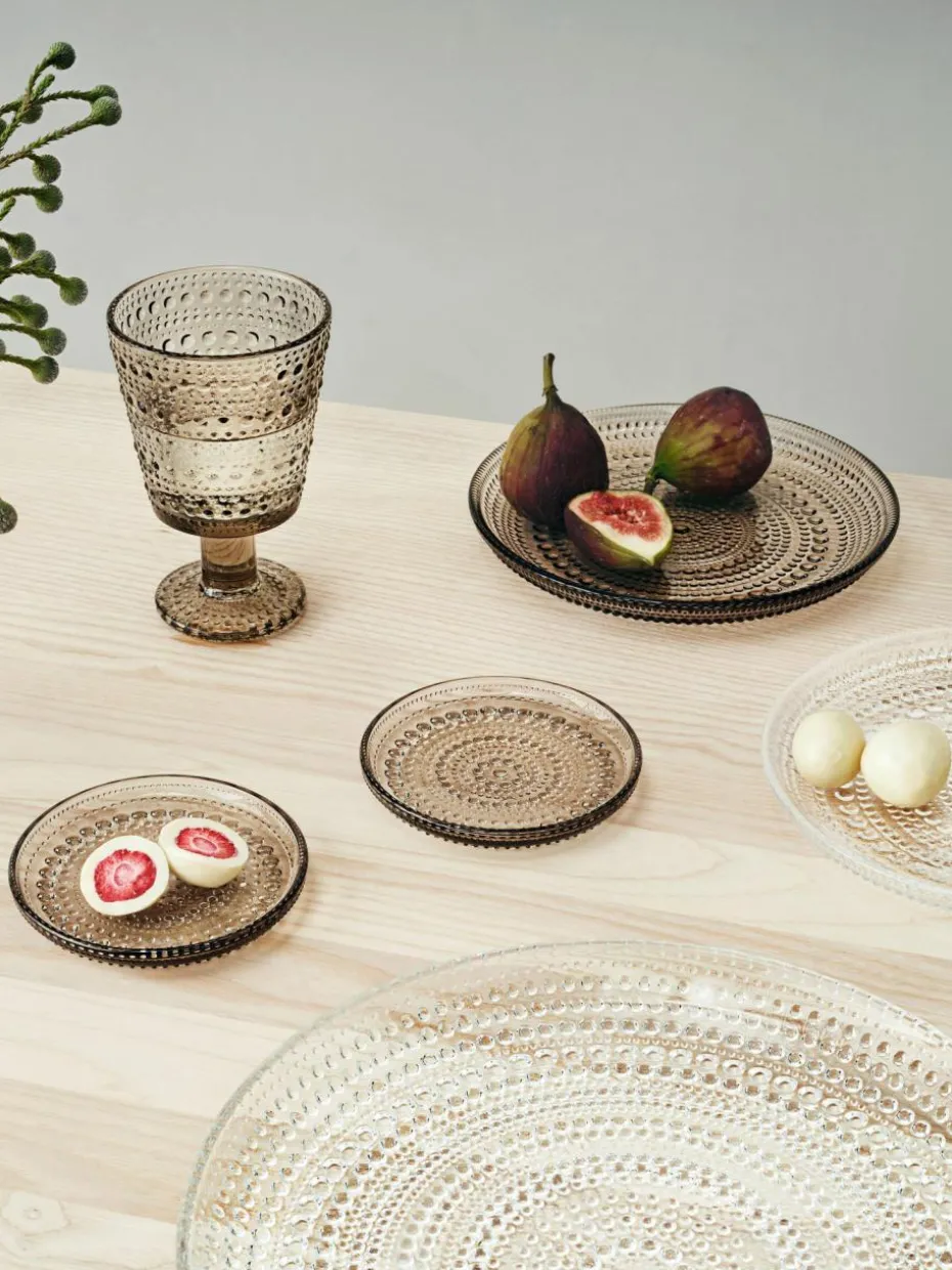 Kastehelmi wurde von Tautropfen, die wie eine Reihe kleiner Glasperlen in der Morgensonne glitzern, inspiriert. Der Name bezieht sich auf die Kreise feiner Bläschen in dem gepressten Glas, die jedem Stück der Kollektion einen eigenen Charakter verleihen. Ursprünglich von Oiva Toikka im Jahr 1964 entworfen wurde Kastehelmi im Jahr 2010 neu aufgelegt. Heute wie damals ist Kastehelmi eine der beliebtesten Serien im Sortiment von Iittala.