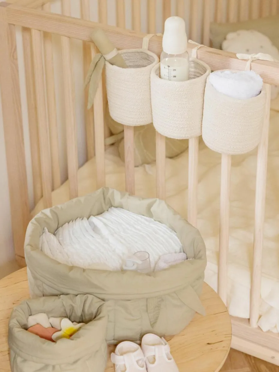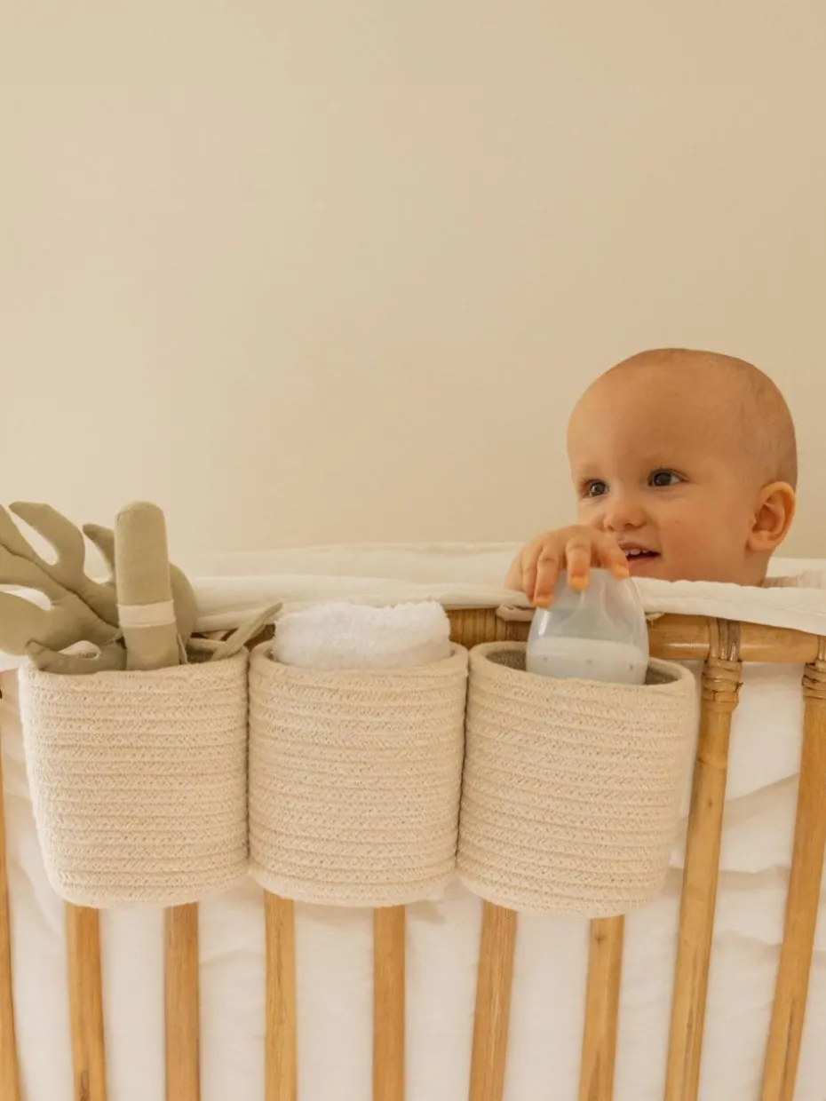Ein hängender Korb, der aus drei miteinander genähten, mini zylinderförmigen Körben besteht, hergestellt aus geflochtenen Bändern aus recycelten PET-Fasern und mit Baumwolle überzogen. Der Korb ist so gestaltet, dass er an der Außenseite des Kinderbettes befestigt werden kann, um die Fläschchen, Beißringe und Lieblingsrasseln Deines Babys an ihrem Platz zu halten. Er lässt sich einfach mit weichen Baumwollbändern am Kinderbett befestigen.