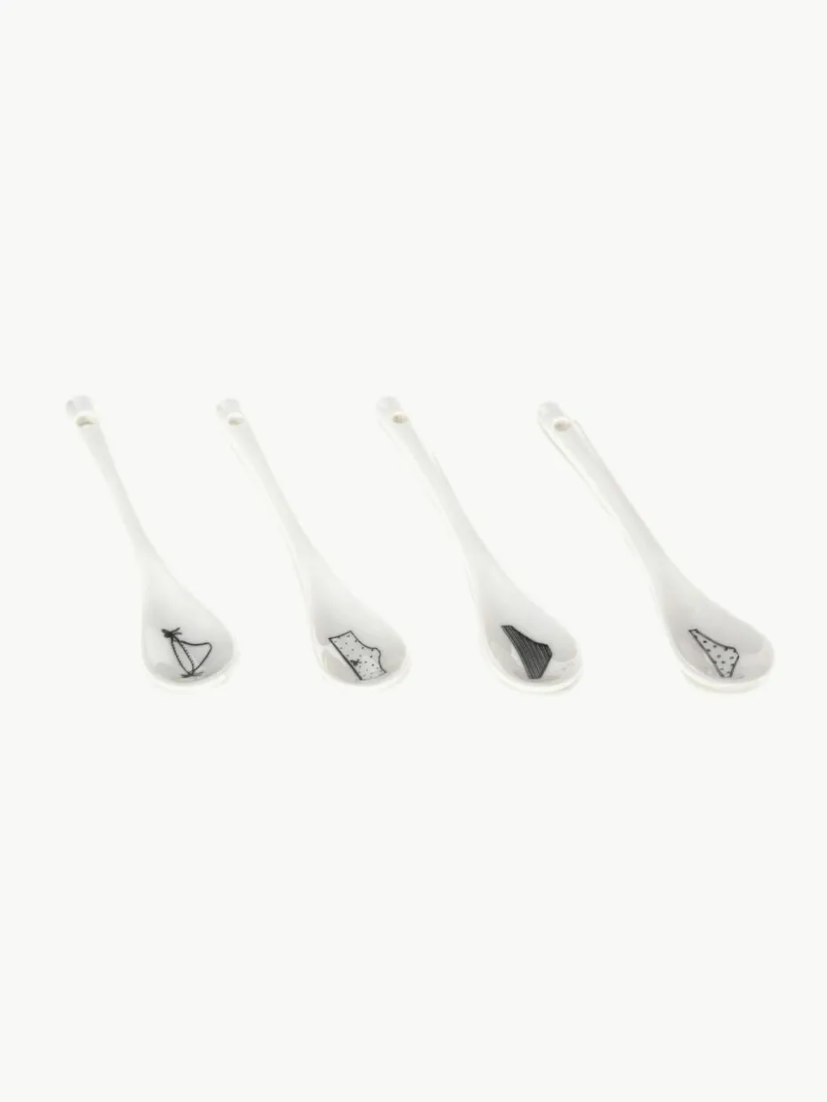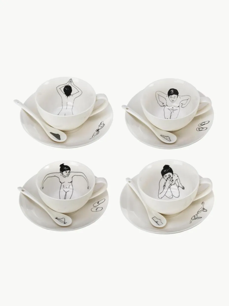 Handbemalte Kaffeetassen Undressed mit Untertassen und Löffeln, 4er-Set