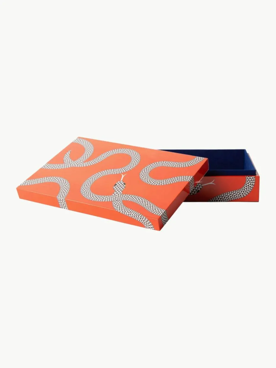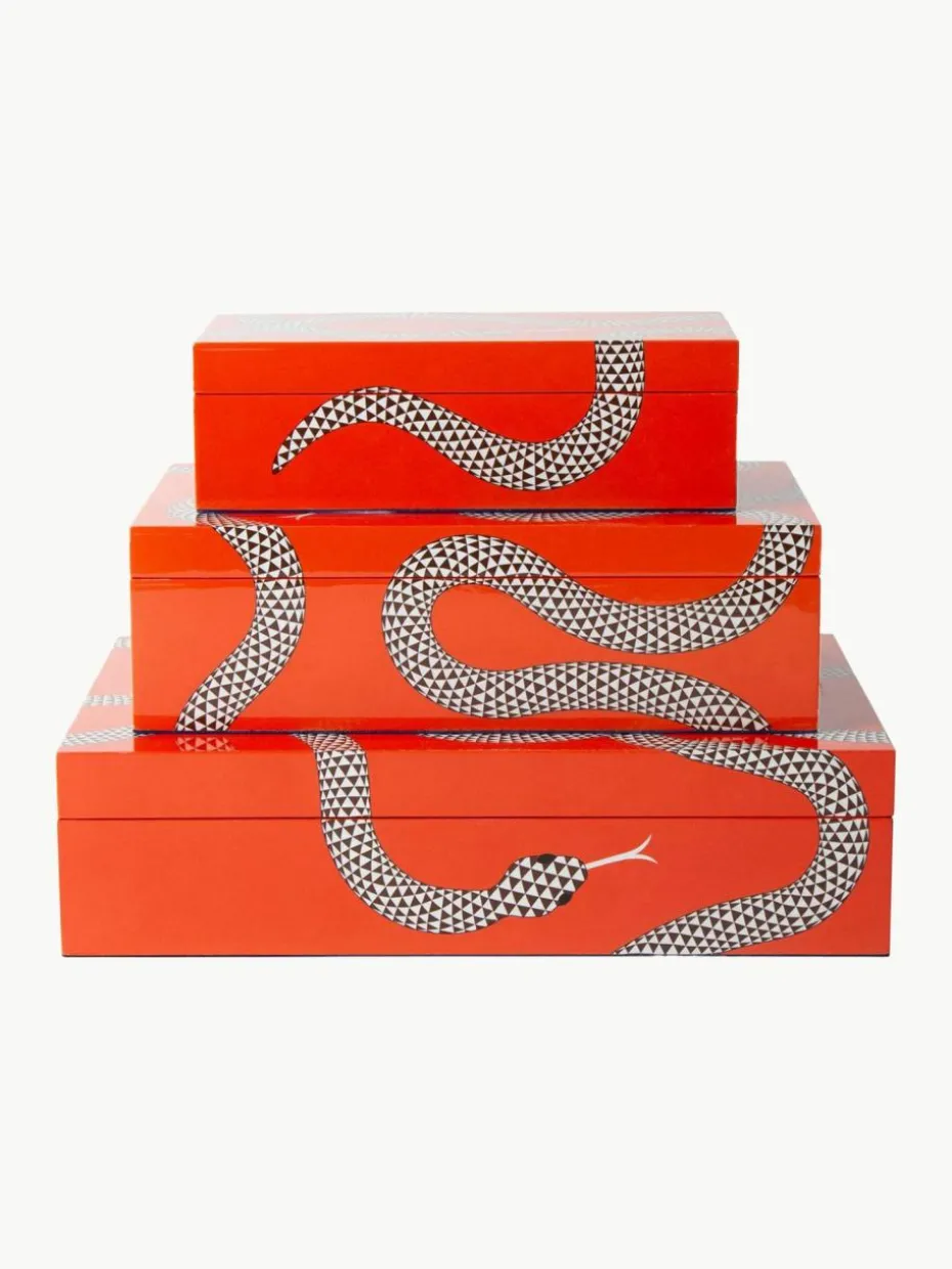 Mit eleganten Schlangen auf einem hochglänzenden Hintergrund sind die handgefertigten Eden Aufbewahrungsbox eine schicke und charmante Ergänzung für ein Regal, eine Kommode oder ein Tischarrangement. Erhältlich in drei Größen zum Verstauen, Stapeln oder als eigenständiges Statement.