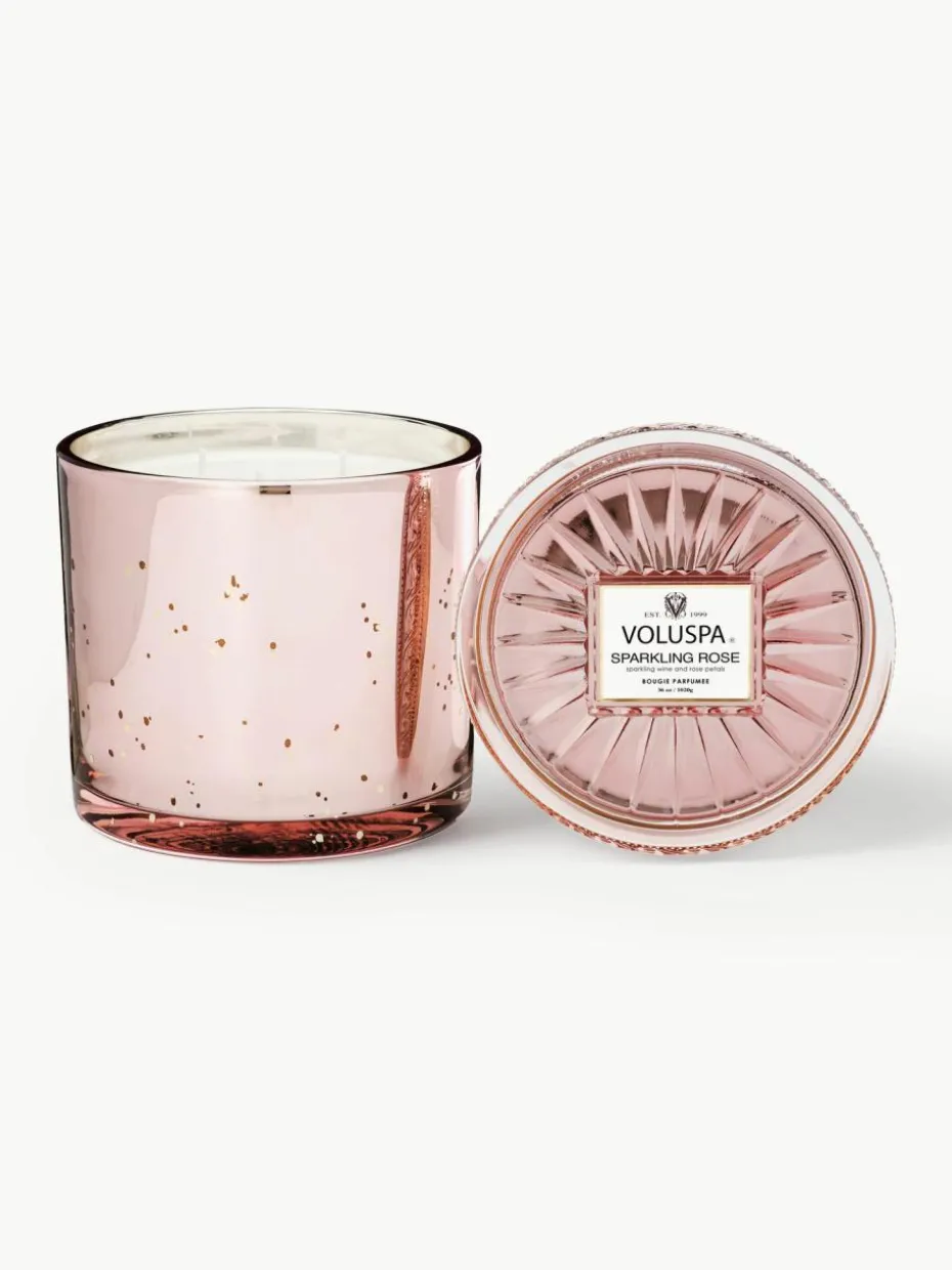 Handgefertigte Dreidocht-Duftkerze Bougie Parfumee (Sekt & Rosenblüten)