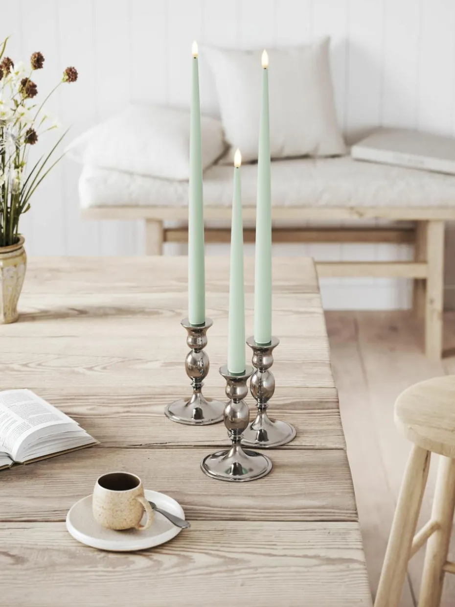 Die LED-Kerzen von Deluxe Homeart zeichnen sich durch ihr einzigartiges Design aus, das perfekt zu einem modernen Zuhause passt, ohne dabei den klassischen Charme zu verlieren. Sie sind elegant und jede Flamme wird sorgfältig mit der Real-Flame-Technologie gestaltet, die eine unglaublich realistische Leuchtkraft bietet.“,“pdp_care_label“:“2 benötigte Batterien je Kerze, Typ AAA, sind nicht im Lieferumfang enthalten