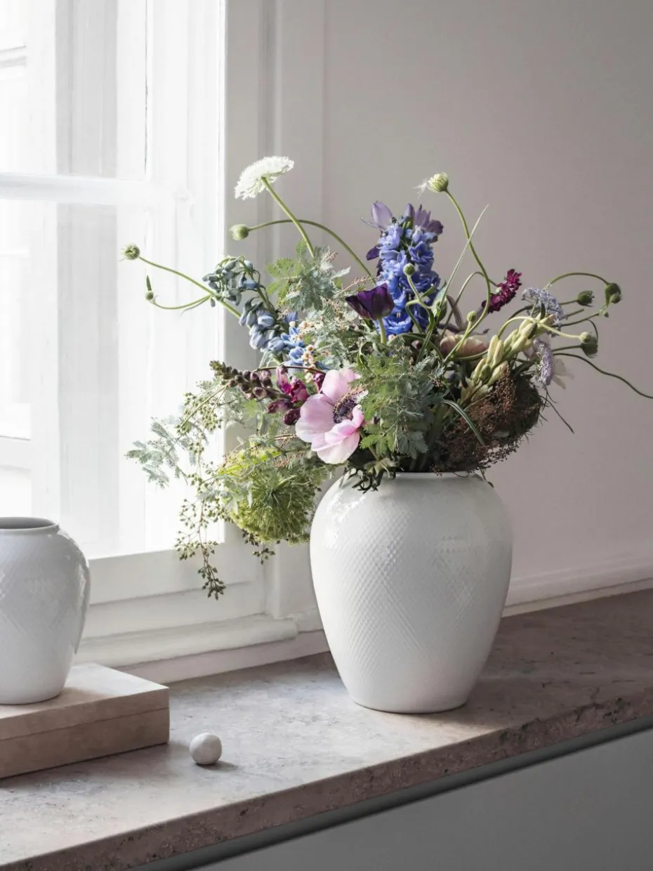 Die wunderschöne weiße Rhombe-Vase zeigt das klassische Rautenmuster, das in den 1960er-Jahren kreiert wurde. Die Strukturen werden Schicht für Schicht in einem sehr komplexen Prozess aufgebaut, den viele Porzellanhersteller heute nicht mehr durchführen. Das komplexe Muster verleiht der Vase einen schönen, klassischen Look und sorgt gleichzeitig für ein angenehmes taktiles Erlebnis.