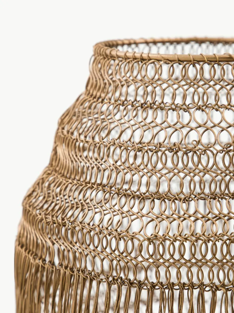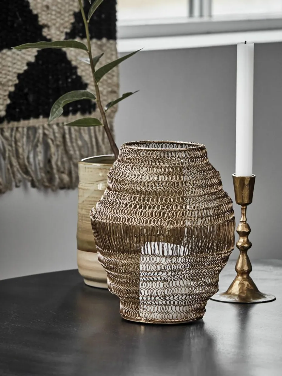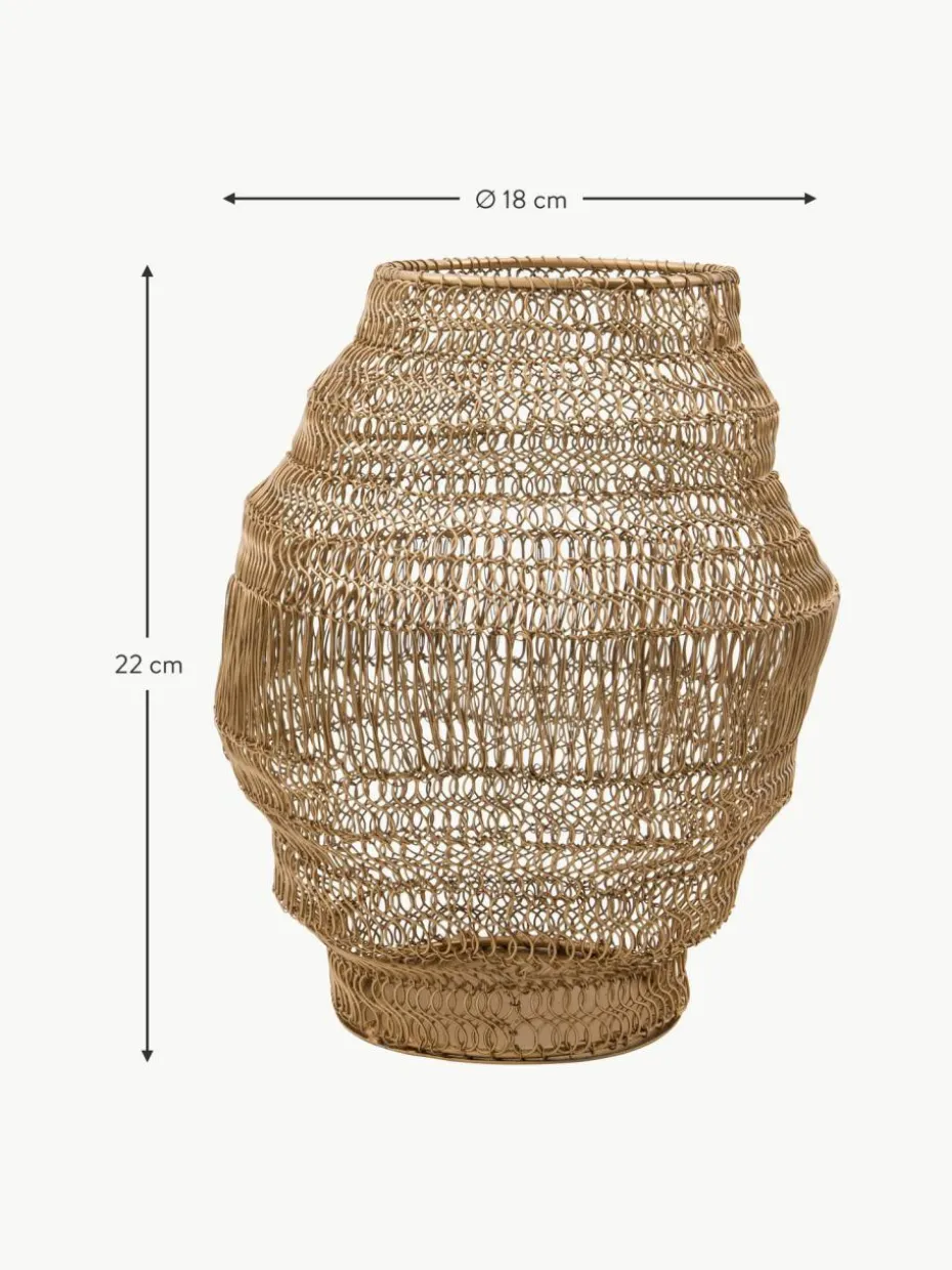 Sein einzigartiges handgefertigtes Design und die elegante goldene Farbe machen ihn zu einem stilvollen Accessoire. Die Konstruktion aus Eisendraht sorgt für Stabilität, während das Windlicht Deinem Raum eine individuelle Atmosphäre verleiht.