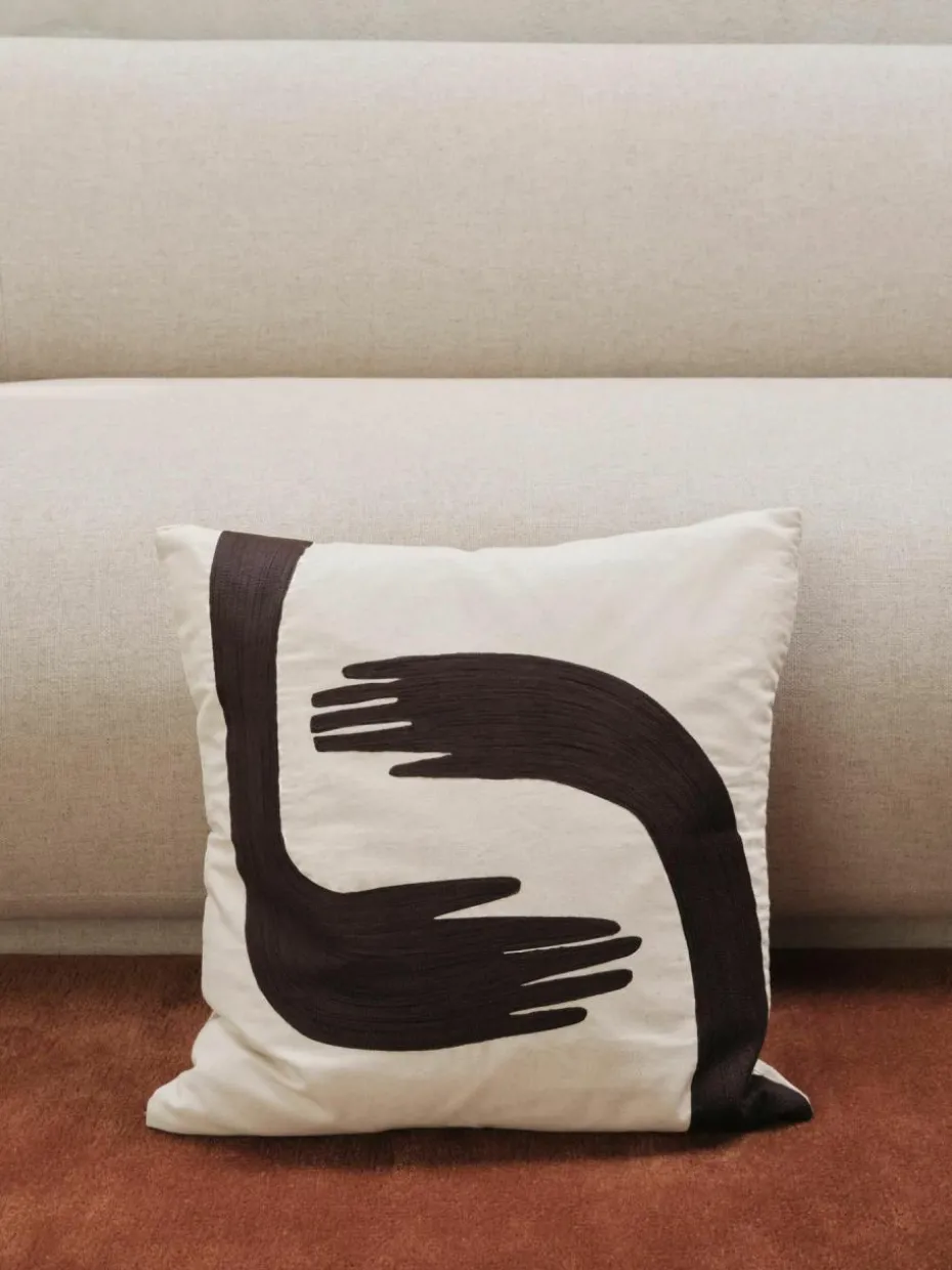 Das POSE Kissen zeigt stilisierte Armmotive, die von antiken „Kastagnetten“ inspiriert sind: Schlaginstrumente in Form von Unterarmen, die menschliche Verbundenheit, Kreativität und Ausdruck symbolisieren. Das Kissen besteht aus GOTS-zertifizierter Bio-Baumwolle und ist mit handgestickten Motiven verziert. Diese dreidimensionale Kettenstickerei verleiht dem POSE Kissen eine zusätzliche Dimension und macht es zu einem echten Hingucker auf Sofa, Bett oder Sessel.