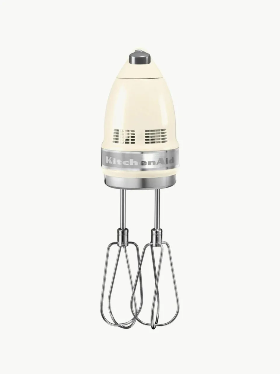 Der digitale Handrührer ist der kleine Bruder der klassischen KitchenAid Küchenmaschine. Er eignet sich besonders für alle, die viel und gerne kochen oder nur eine begrenzte Arbeitsfläche haben. Der robuste Gleichstrommotor (85 Watt) ist mit einer digitalen LED-Anzeige kombiniert, die für Präzision und Leistung sorgt. Die Standardausstattung umfasst zwei Turborührbesen aus Edelstahl, die sich ideal für schwere Massen oder größere Mengen eignen. Außerdem gibt es vier weitere Zubehörteile, darunter zwei Knethaken, einen Schneebesen, einen Mixerstab und einen schützenden Aufbewahrungsbeutel. Wählen aus fünf klassischen KitchenAid Farben: Rot, Schwarz, Cremeweiß, Silbergrau oder Salbeigrün.