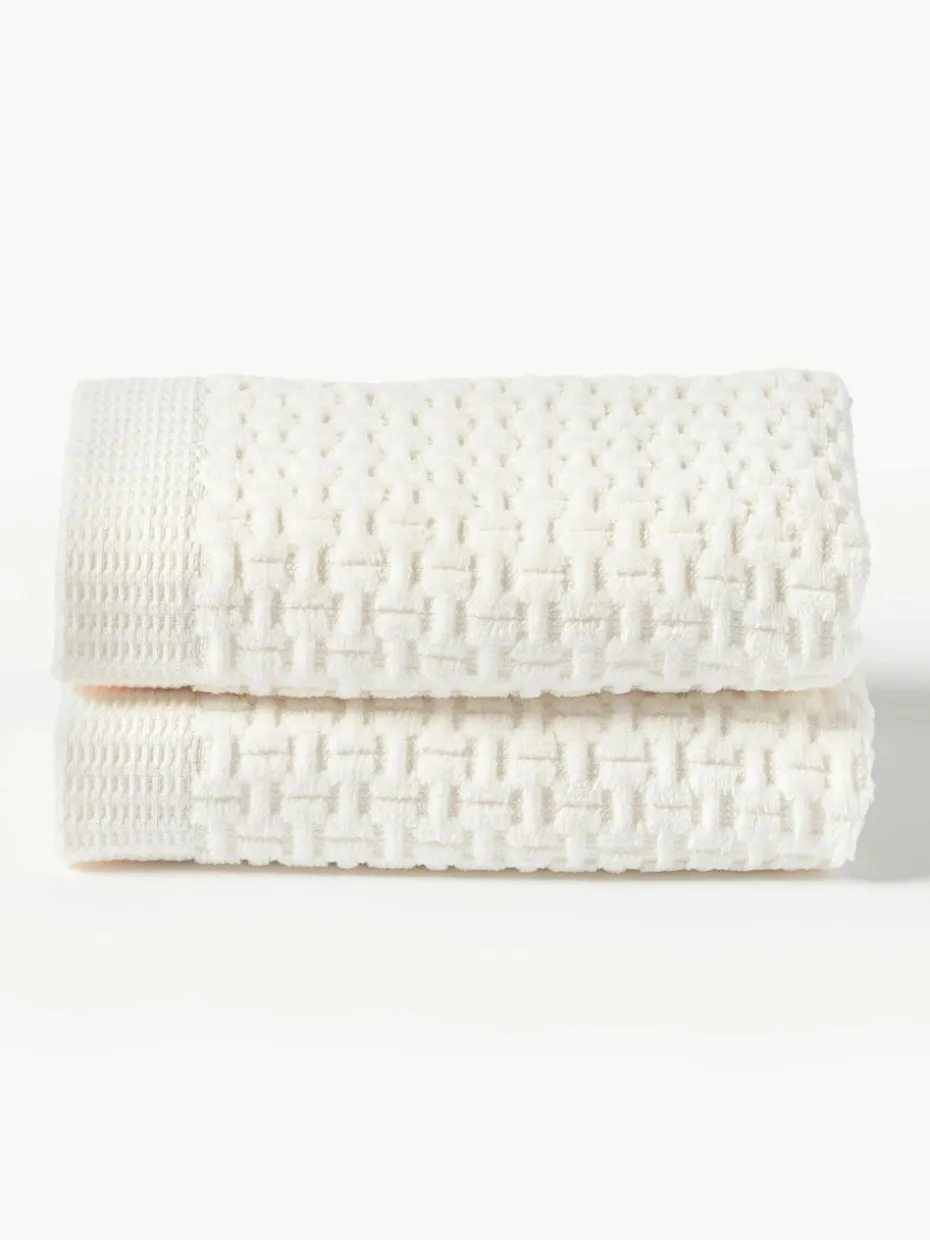 Die Gästehandtücher verfügen über Aufhängeschlaufen und wurden in Portugal gefertigt.