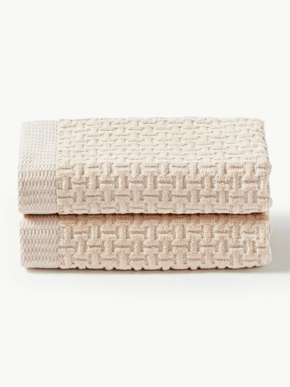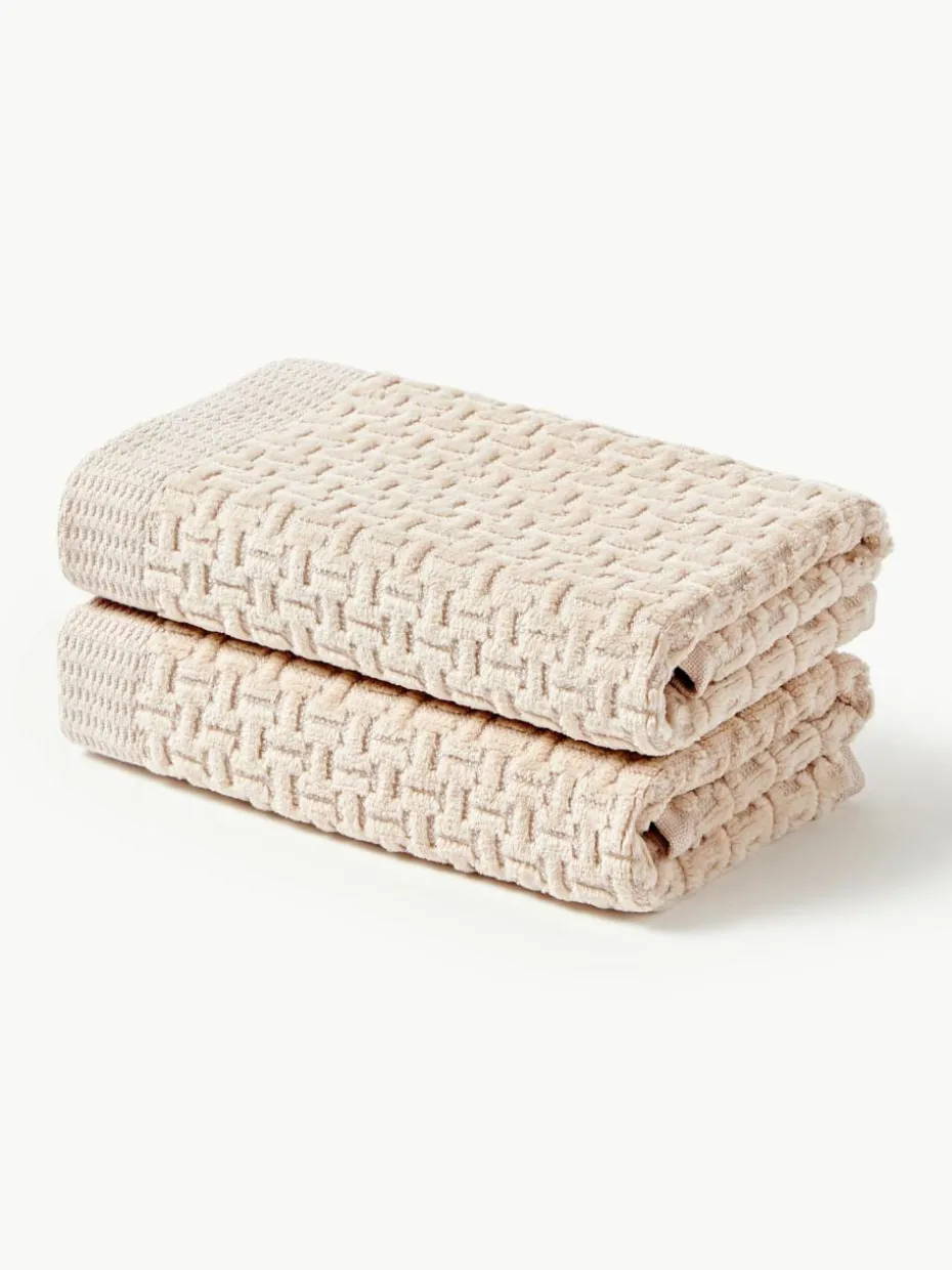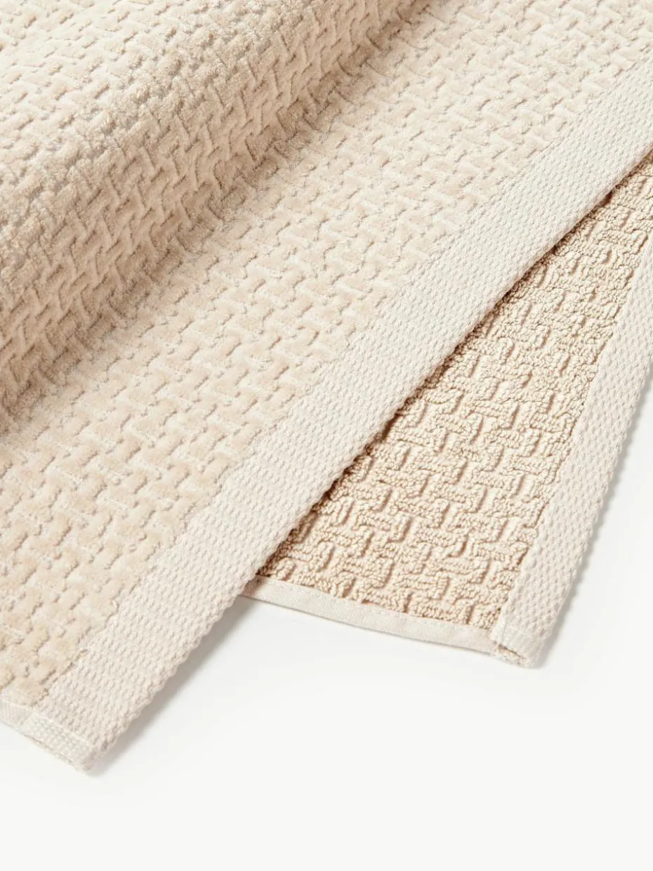 Die Handtücher verfügen über Aufhängeschlaufen und wurden in Portugal gefertigt.