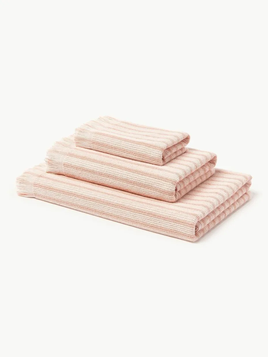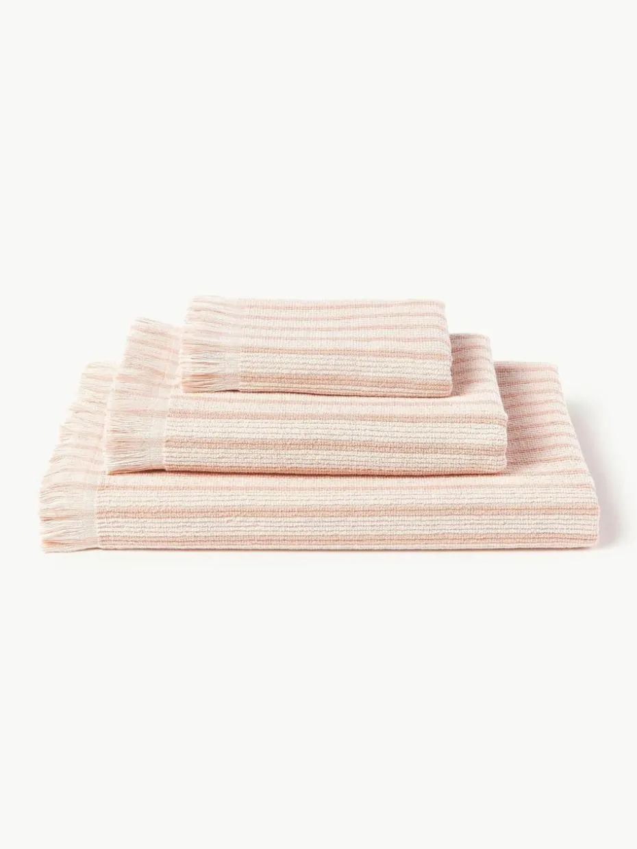 Dieses Handtuch-Set bestehend aus zwei Handtüchern und zwei Duschtüchern verfügt über eine Aufhängeschlaufe und wurde in Portugal gefertigt.