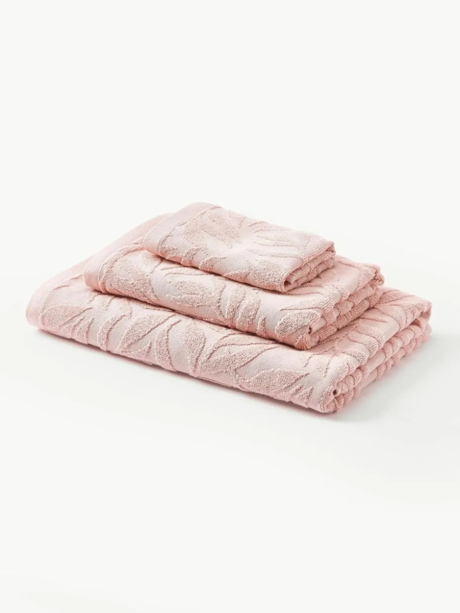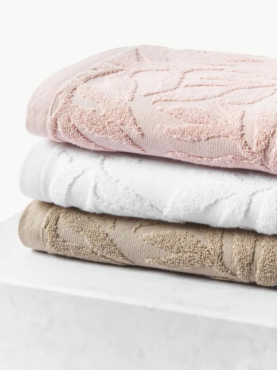 Handtuch-Set mit Hoch-Tief-Muster bestehend aus einem Gästehandtuch, einem Handtuch und einem Duschtuch verfügt über eine Aufhängeschlaufe und wurde in Portugal gefertigt.
