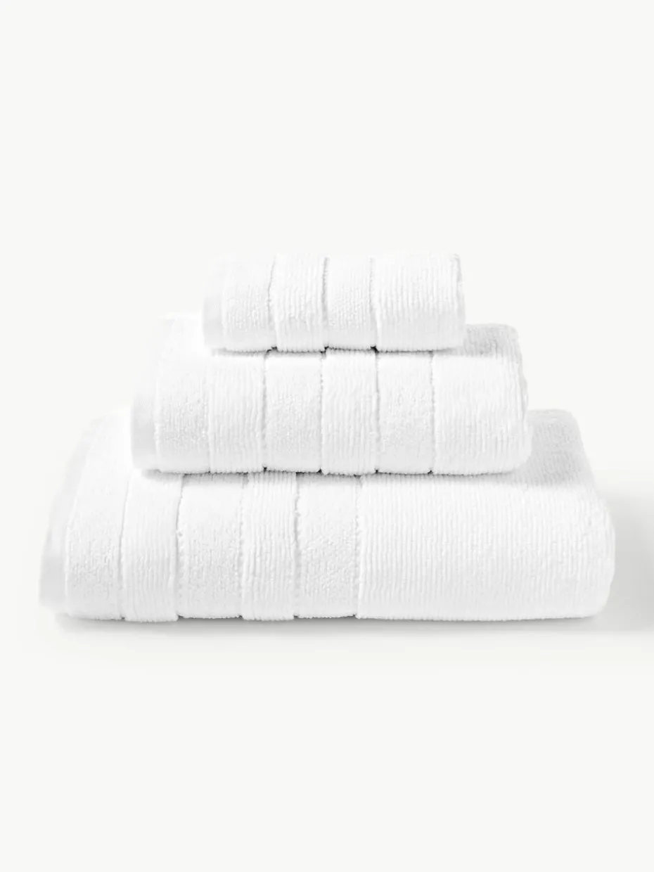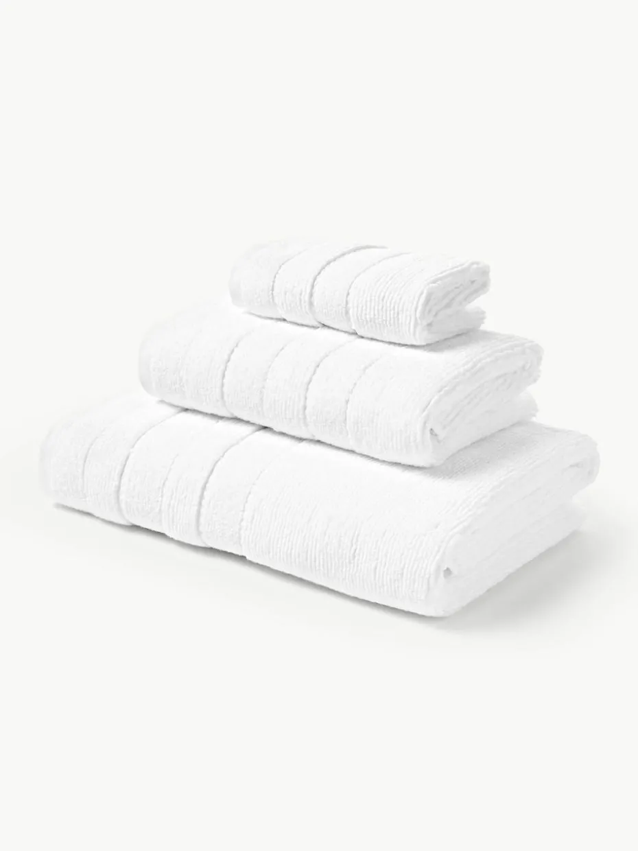 Das Handtuch-Set mit Aufhängeschlaufen besteht aus zwei Gästehandtüchern, zwei Handtüchern und zwei Duschtüchern und wurde in Portugal gefertigt.