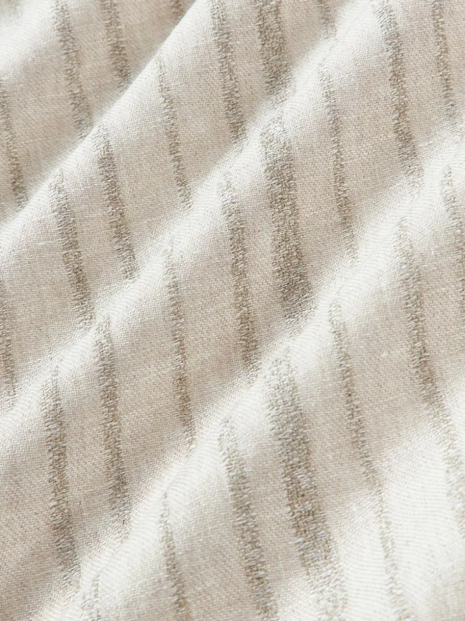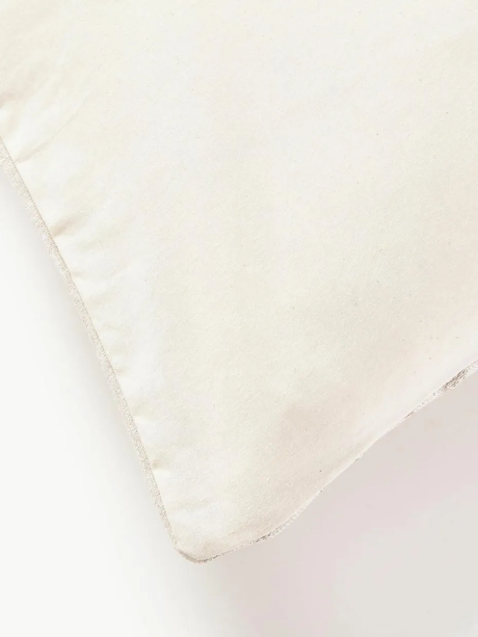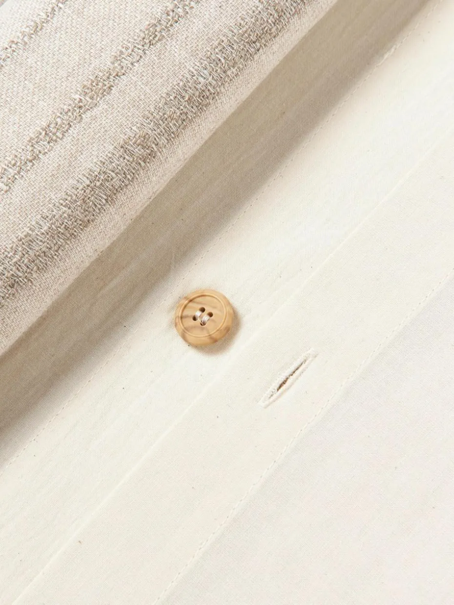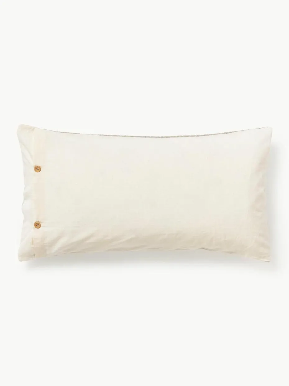 Der Hanf-Kopfkissenbezug mit verschiedenen Materialien auf Vorder- und Rückseite verfügt über einen Knopfverschluss und wurde in Portugal gefertigt.