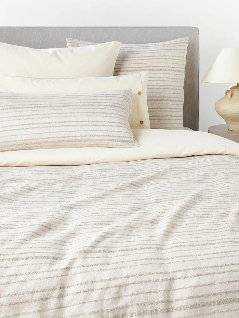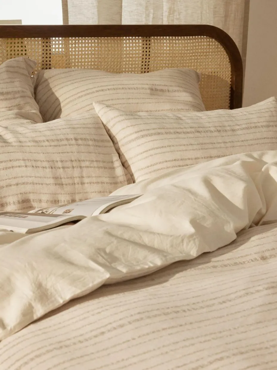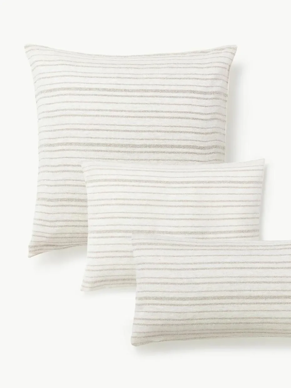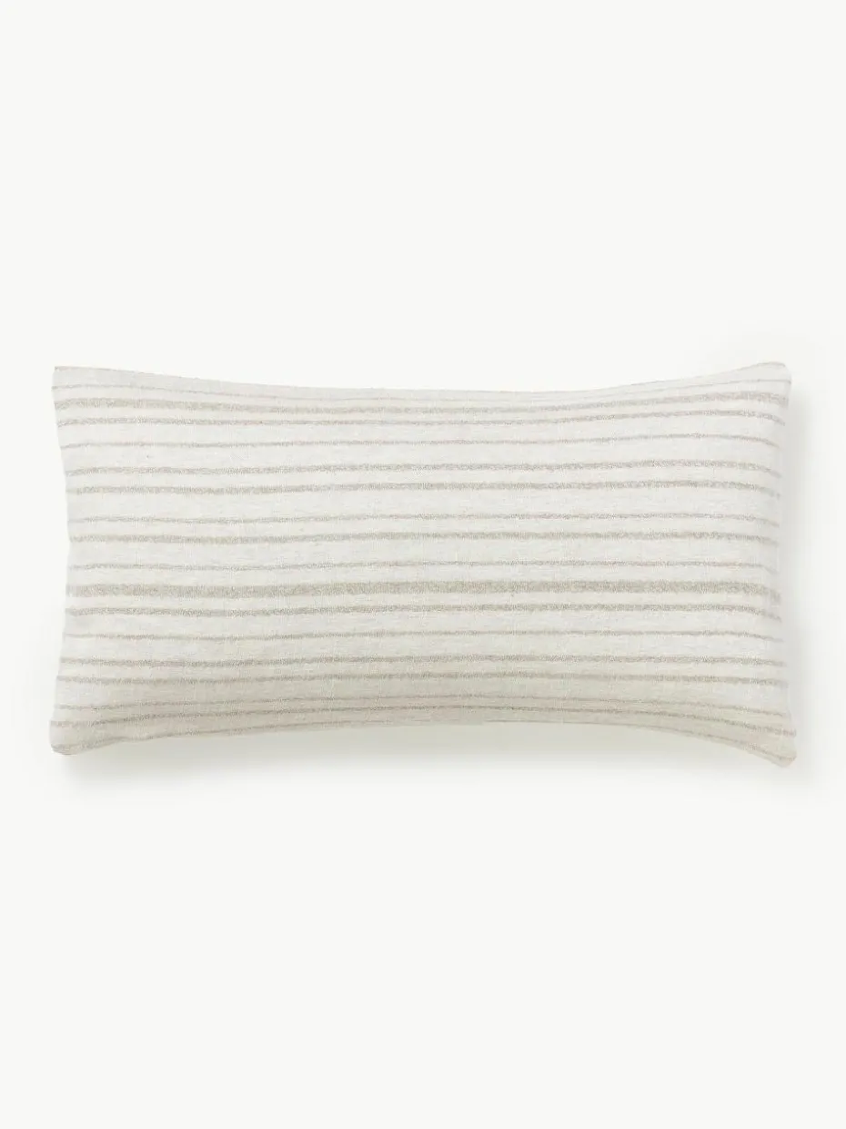 Der Hanf-Kopfkissenbezug mit verschiedenen Materialien auf Vorder- und Rückseite verfügt über einen Knopfverschluss und wurde in Portugal gefertigt.