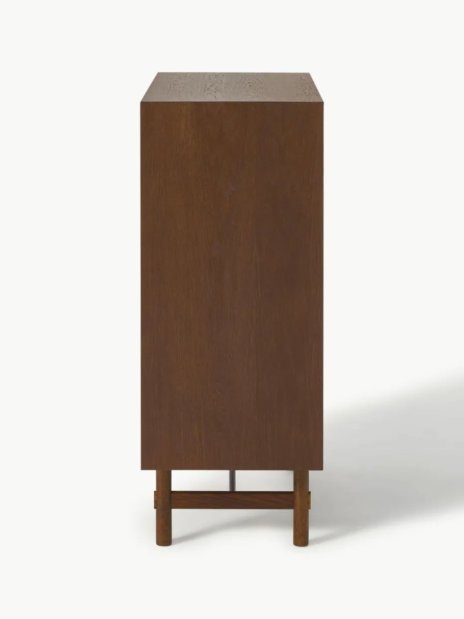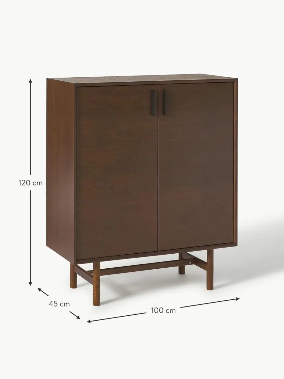 Das Highboard verfügt über zwei Türen und sechs Fächer.
